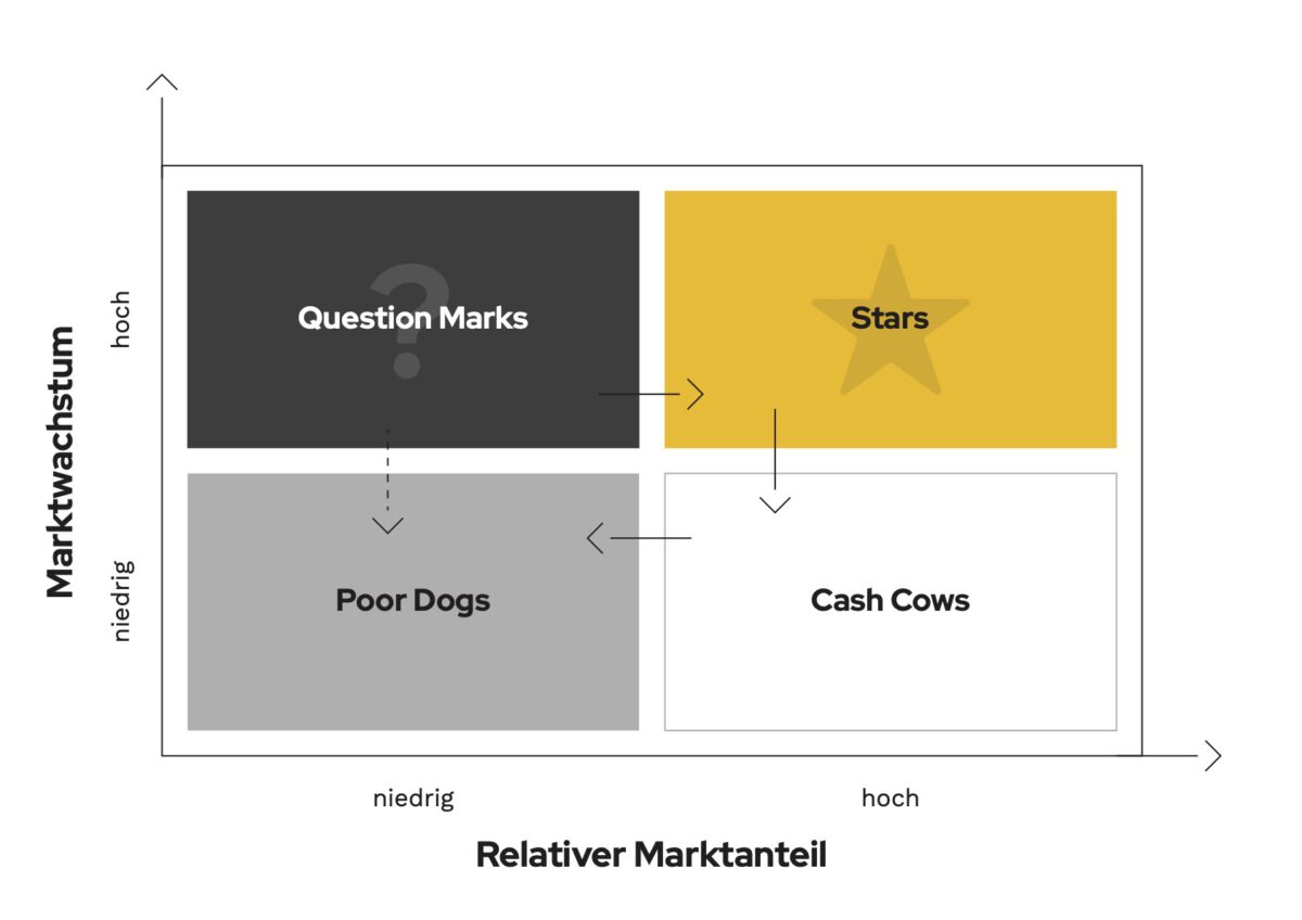 Die Boston Consulting Group hat mit ihrer BCG-Matrix ein gutes Basis-Modell geschaffen, welches sehr hilfreich sein kann, um Marken in vier Kategorien zu untergliedern. Je nach angestrebtem Marktwachstum und bereits bestehendem Marktanteil lassen sie Marken in Question Marks, Stars, Poor Dogs oder Cash Cows unterscheiden.