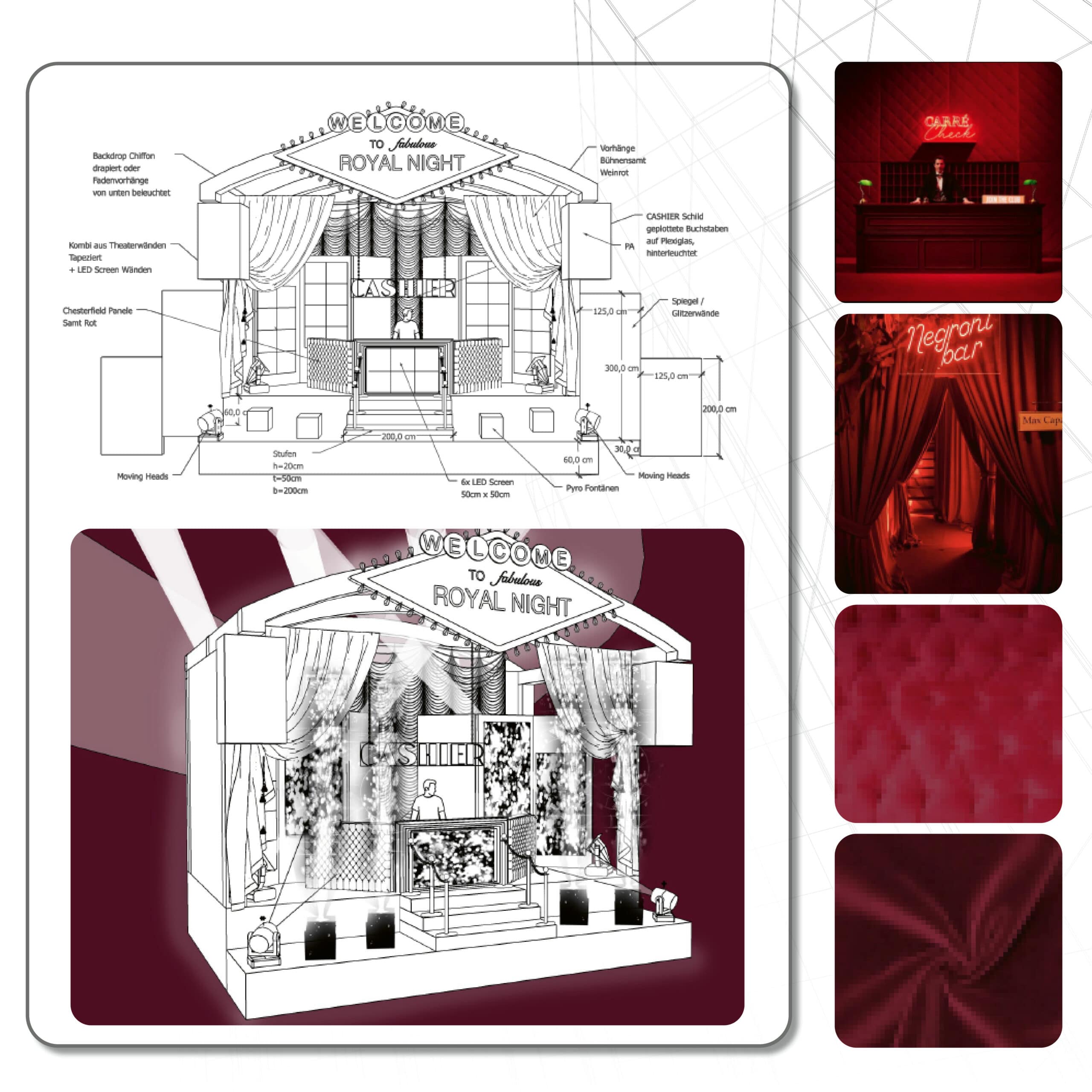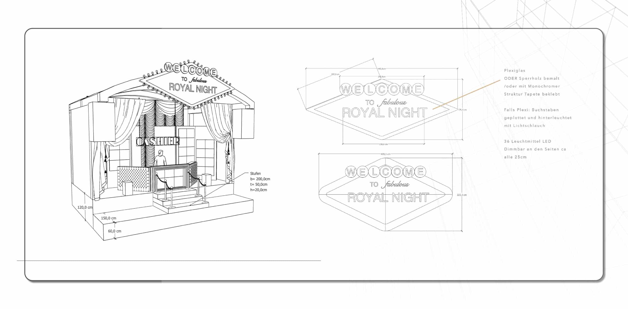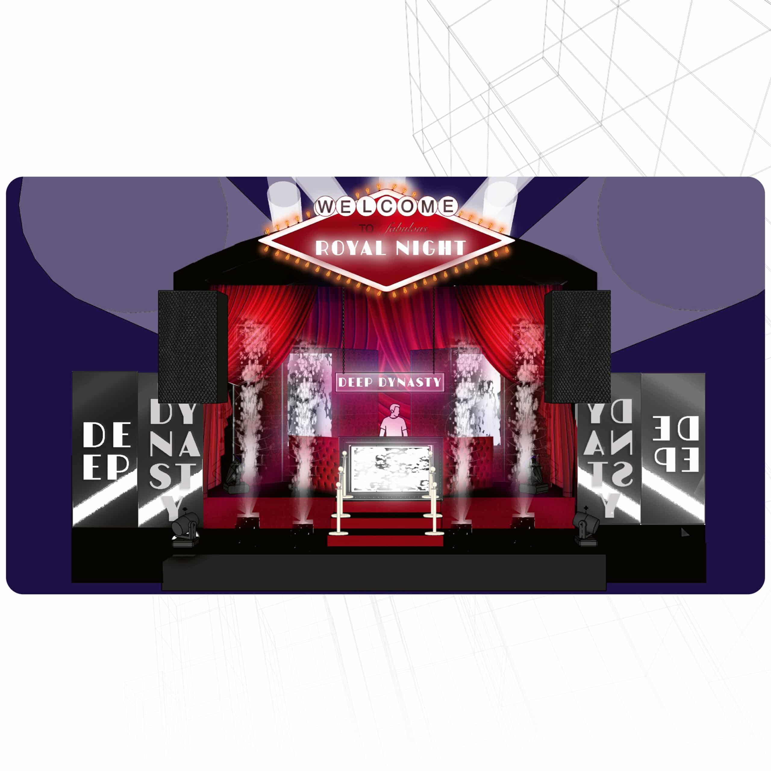 Die Royal Night ist ein bedeutendes Treffen der Tuning Szene, das Teilnehmer aus ganz Deutschland und den angrenzenden Ländern anzieht. Den Entwurf und die Realisierung des Bühnenbilds für die Veranstaltung lieferte MATTER & LØUT. Unser Ziel war es, ein Bühnenbild zu schaffen, das das Thema “Royal” auf eine edle und kreative Weise unterstreicht und eine Atmosphäre schafft, die Besucher in ihren Bann zieht. Das Projekt wurde in enger Zusammenarbeit mit dem Team von Berger VT umgesetzt. Das Bühnenbild wurde in Absprache mit dem Kunden Schritt für Schritt entworfen und nach finaler Abstimmung in der Werkstatt vorbereitet. Dabei lag ein besonderer Fokus auf der optimalen Verbindung von Gestaltungselementen und der Bühnen-, Licht-, Ton- und Pyrotechnik. Der Aufbau vor Ort wurde schließlich von MATTER & LØUT geleitet.