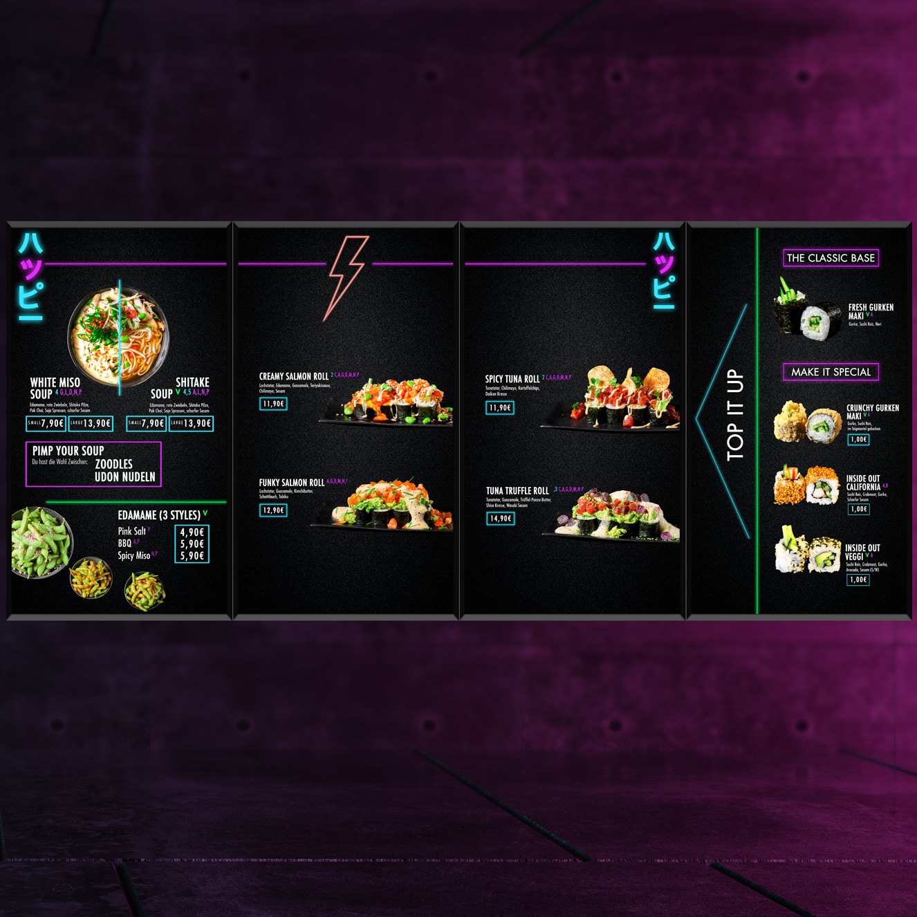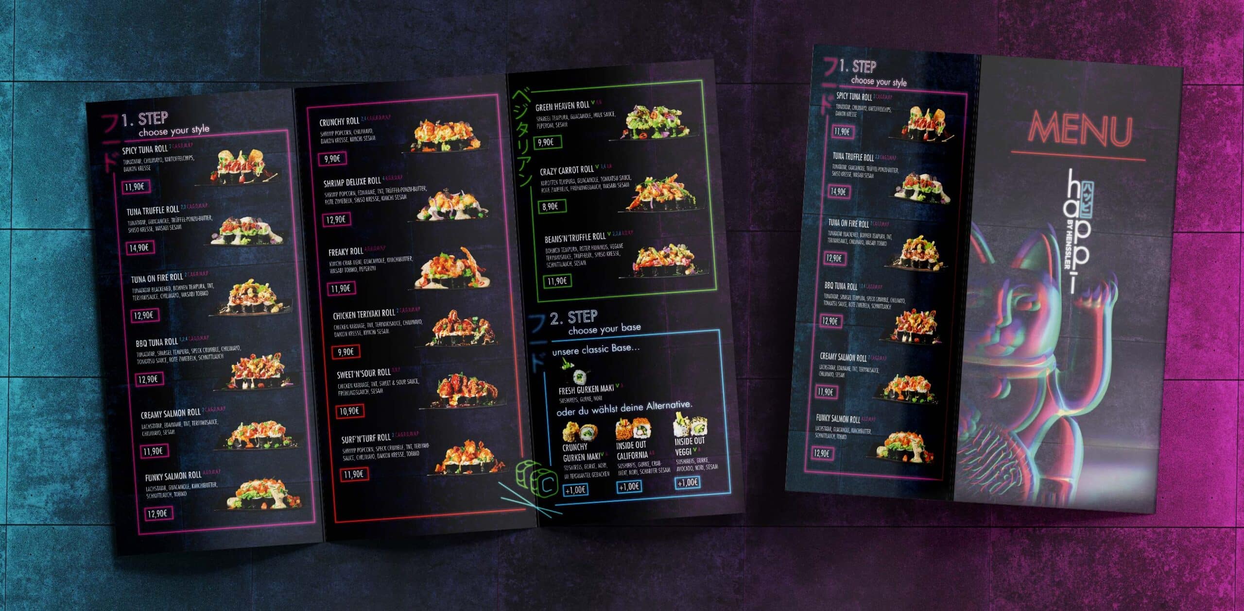 “Funky Food, Simply Good!” – so beschreibt das happi by Henssler die Speisen, welche inhouse, to go oder zu Hause durch Lieferung serviert werden. Für den ersten Standort setzte Weder & Noch, neben Printprodukten wie Flyern, Visitenkarten und weiteren Materialien für die Geschäftsausstattung, auch die Speisekarte und die Bestellmonitore um. Für das Food-Fotoshooting für die beiden Varianten der Speisekarten haben wir Vorgaben geliefert und waren während der Produktion auch vor Ort. Daraus entstand die gedruckte Speisekarte und die animierten Monitore. Ein paar Eindrücke des Designs sind hier zu sehen. Für das Original: Einfach einen Stopp im neuen happi by Henssler in Bremen Überseestadt einlegen! Der Besuch lohnt sich nicht nur wegen des leckeren Essens!