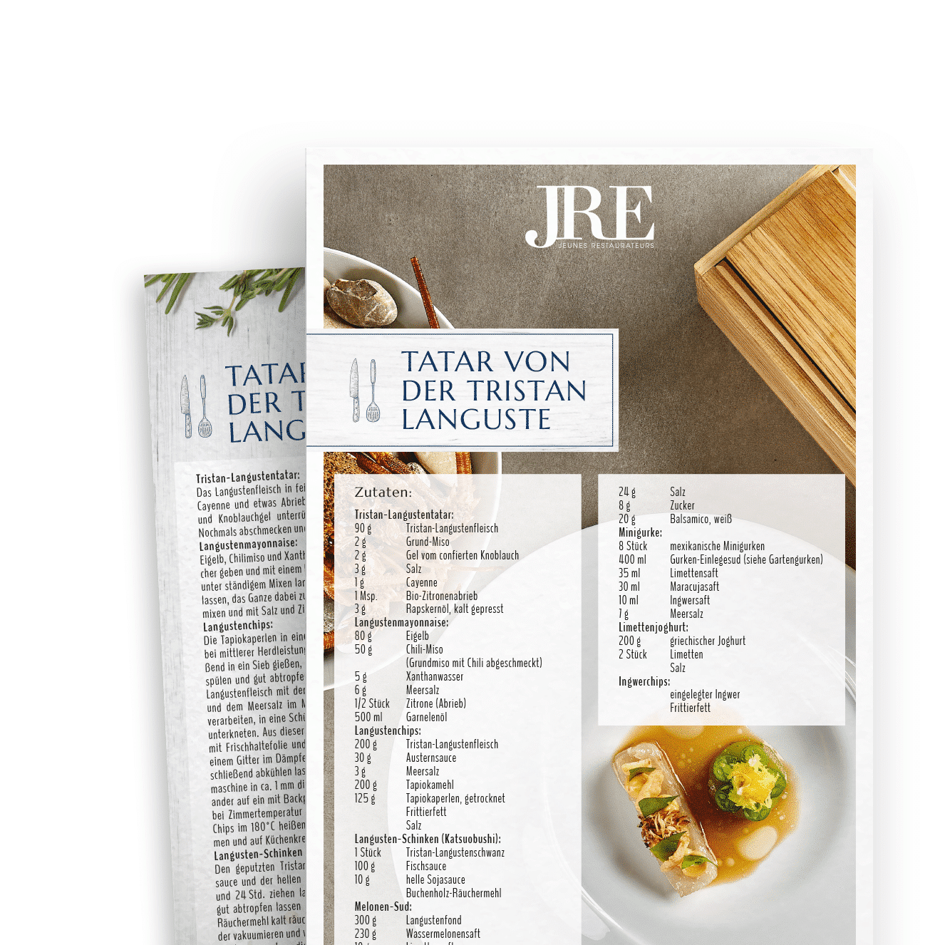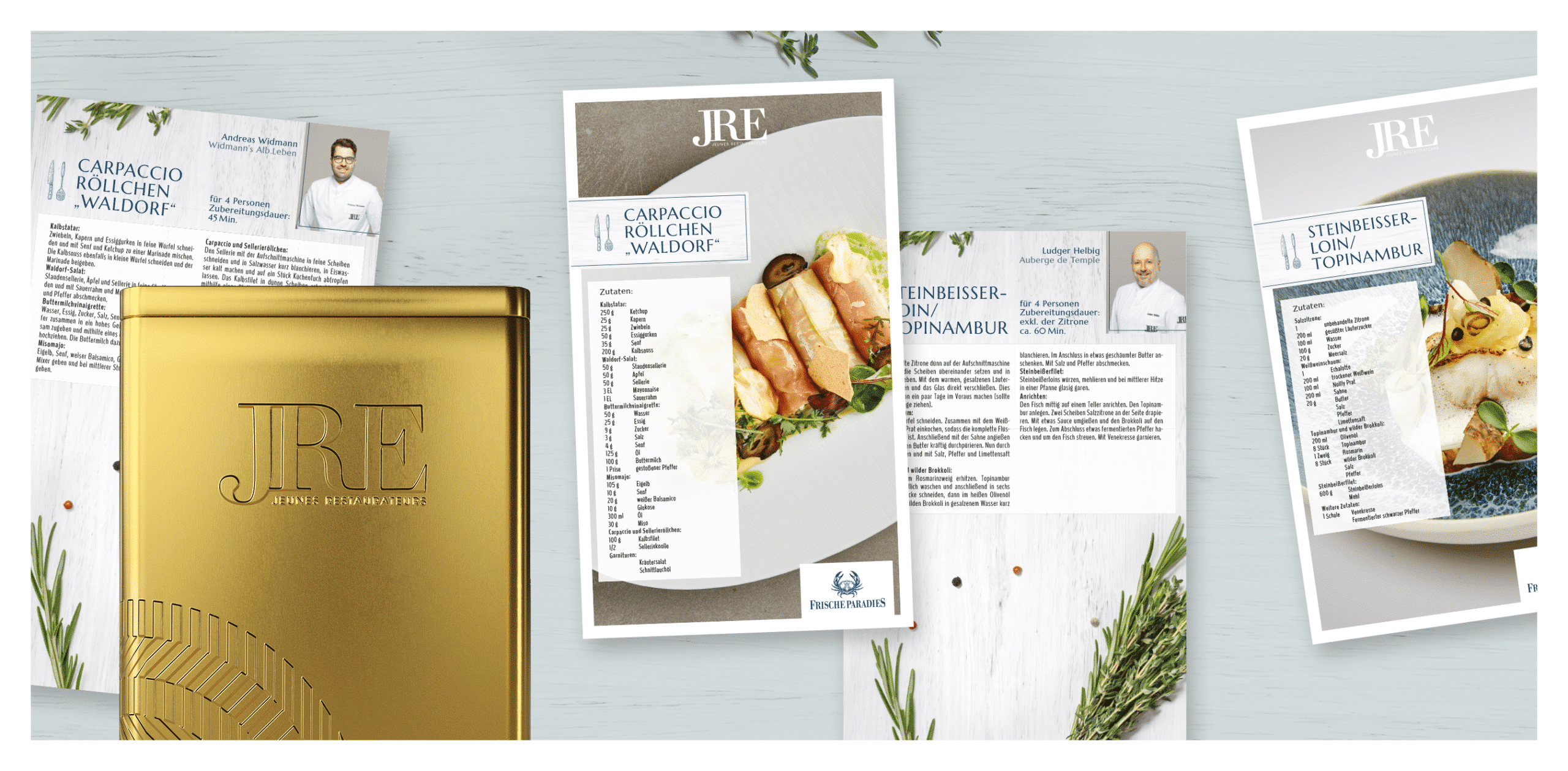 Die JRE Deutschland erweiterten ihre nachhaltige Rezeptkarten-Sammelbox Anfang 2021 um die Kategorie “Rezeptkarten FrischeParadies”. Weder & Noch setzte diese in gewohnt guter Zusammenarbeit mit den Spitzenköchen aus der Region West um. Bei der Regionaltagung kochten die Gastronomen die Gerichte anschließend vor Ort. Danach entstanden sowohl professionelle Food-Pics und passende Texte für die jeweiligen Rezepte. Das Design der Rezeptkarten entwickelten wir unter Berücksichtigung des Corporate Designs des Partners FrischeParadies. Auch das Produktionsmanagement lag komplett bei Weder & Noch.