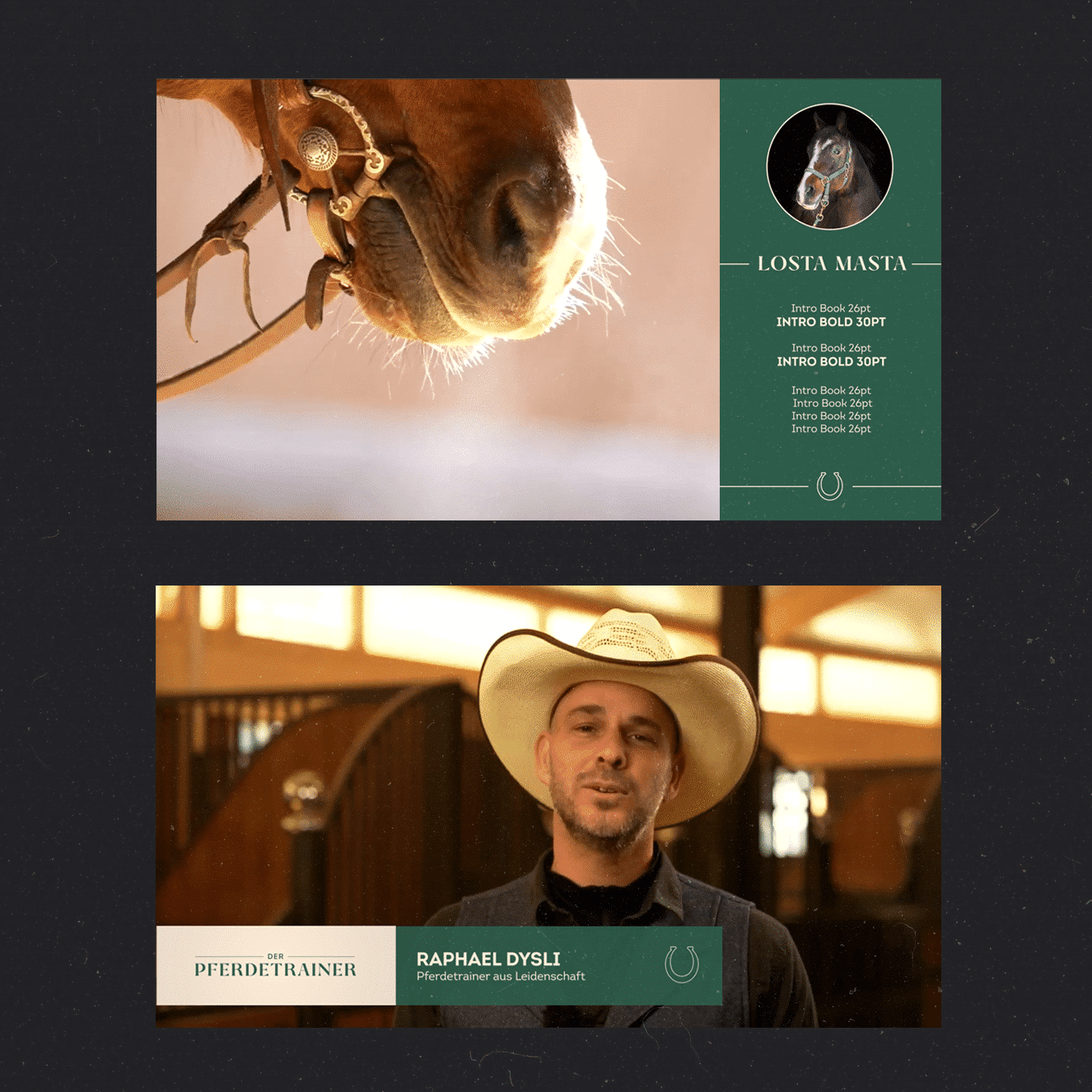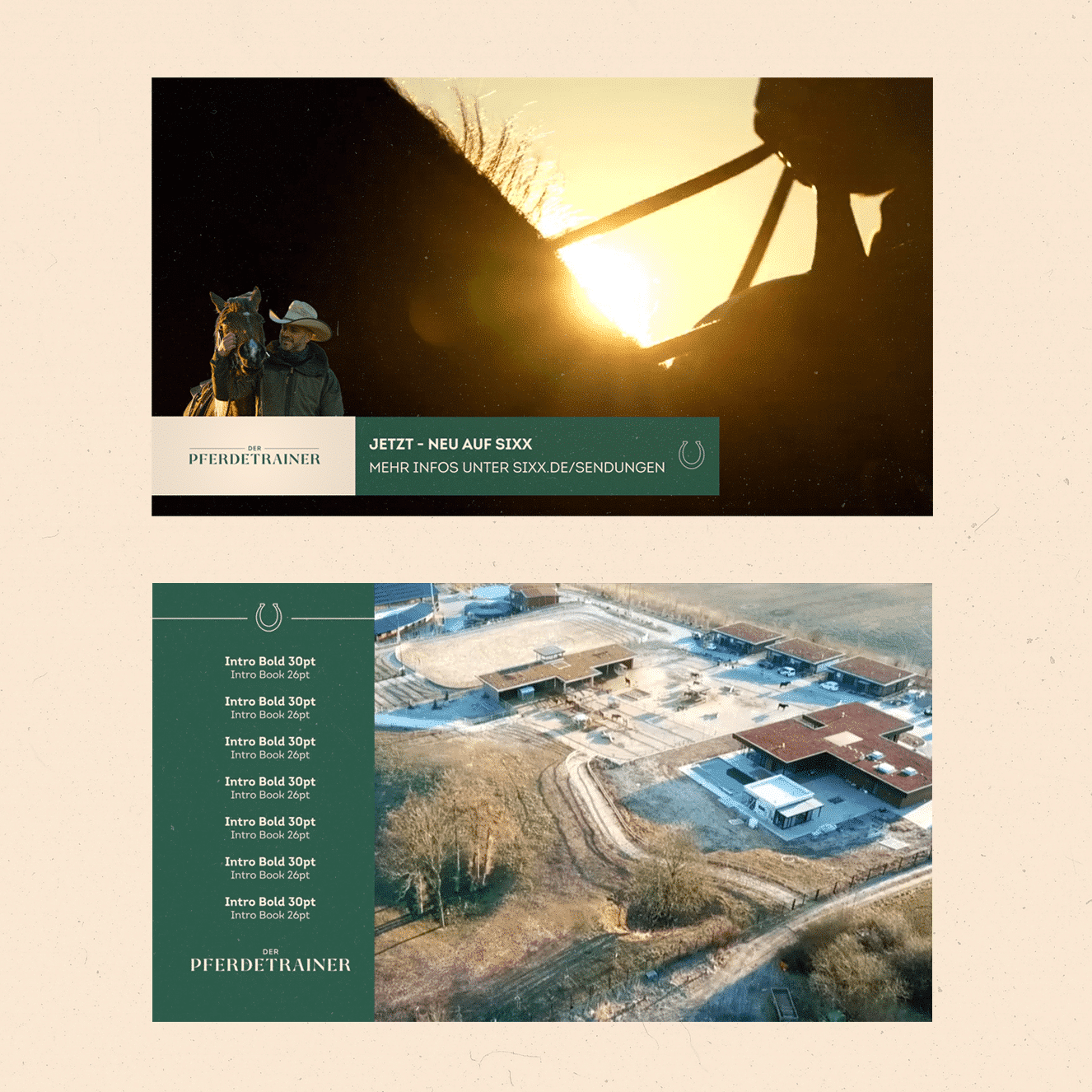 2022 wurden wir vom Sender sixx der seven.one Entertainment Group mit der Gestaltungskonzeption für die neue Sendung “Der Pferdetrainer” beauftragt. Dieses anspruchsvolle Projekt gab uns die Möglichkeit, unsere kreativen Fähigkeiten und unser tiefgreifendes Verständnis für Fernsehproduktionen unter Beweis zu stellen. Wir sammelten Inspirationen, Farben und Bildstimmungen in einem Moodboard, um den gewünschten Look zu vermitteln. Die Moodboards halfen dem Kunden, den visuellen Stil festzulegen, der später die gesamte Show begleiten sollte. Darüber hinaus entwarfen wir ein schlichtes aber einprägsames Typo-Logo, das sowohl das Pferdetraining einfängt als auch den Sender widerspiegelt. Danach konzipierten und gestalteten wir alle erforderlichen TV-Assets, wie Teaser-Trailer, Trailer und Hintergründe, Opener und Ending, Back-to-Break-Übergänge, Adaptionen, Overlays, Titelkarten, Grafiken und vieles mehr. Abschließend kümmerten wir uns um die Erstellung von Logoanimationen und die Gestaltung eines Social-Media-Kits für die Online-Promotion.