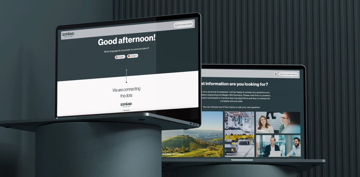 Zum Leistungsumfang gehörten die Namensgebung „EXPÄND into the LÄND“ (Kurzform: „EXPÄND“), die Gestaltung der Wort-Bild-Marke sowie ein umfangreicher CD-Guide. Darauf aufbauend konzipierten und gestalteten wir das Webseitendesign für den neuen Auftritt, mit einer User Experience, die insbesondere Verantwortlichen im Bereich Investment und Expansion eine schnelle und präzise Informationssuche ermöglicht. Ergänzend entwickelten wir mit „WAIKI“ eine KI-Lösung für den Investorenbereich: ein KI-gestütztes Wiki, das individuell Fragen zu Expansion, Ansiedlung, Netzwerken und Standortwahl beantwortet, aktuell auf Deutsch und Englisch. Zusätzlich gibt WAIKI hilfreiche Dokumente, Links zu den Quellen und passende Ansprechpartner aus und kann um weitere Sprachen ergänzt werden. Die neue Marke präsentiert sich seit November 2024.