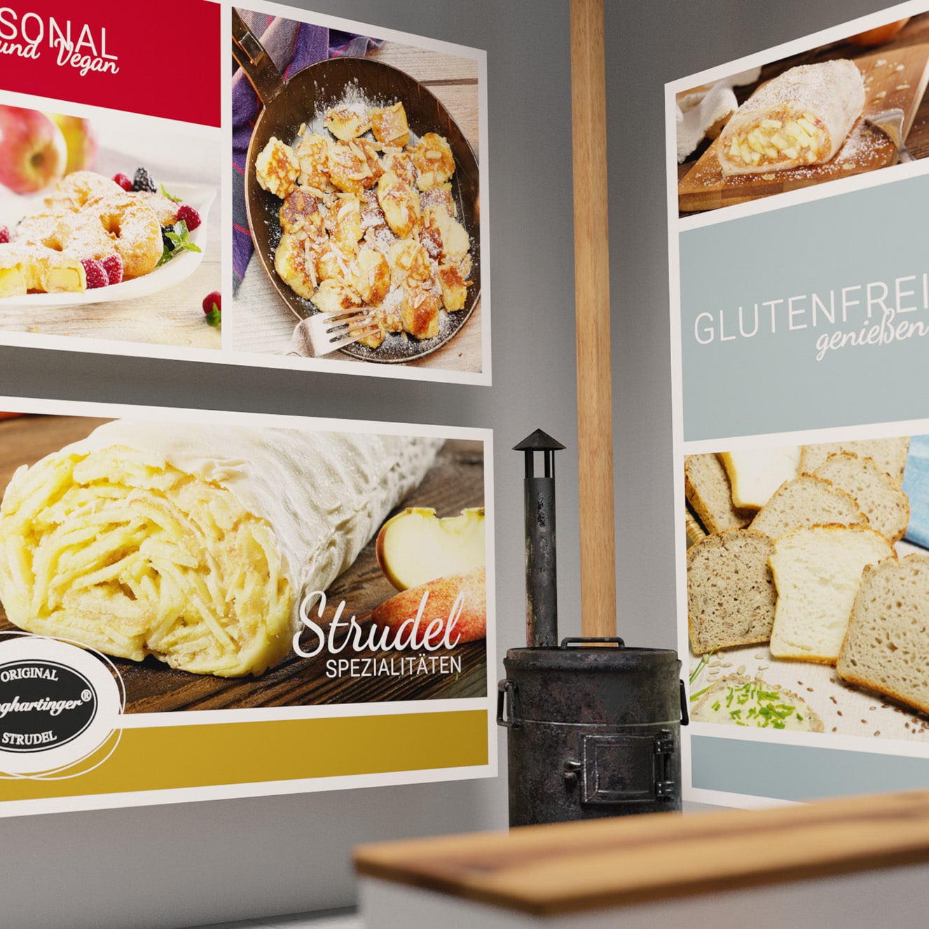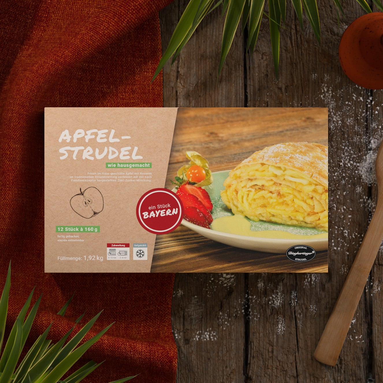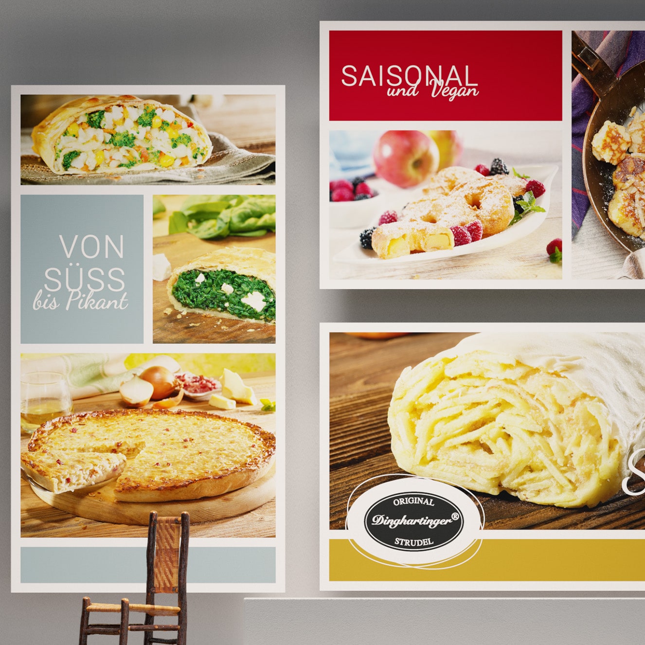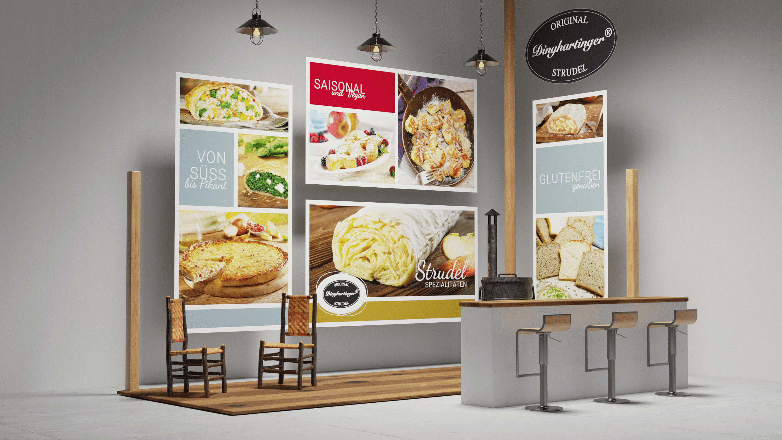 Das Verpackungsdesign gilt oftmals als Visitenkarte der Marke. Dabei sollte sie authentisch und glaubhaft, auch Lust auf das Produkt machen und gleichzeitig informieren. Das Verpackungsdesign ist daher beinahe so wichtig, wie die Qualität des verpackten Produktes. Diese Wichtigkeit hat das Familienunternehmen Dinghartinger, welches sich auf Tiefkühlkost im B2B-Bereich spezialisiert hat, erkannt und so durften wir eine neue Verpackung gestalten. Angefangen haben wir hier bei den Cash Cows der Marke: Apfelstrudel und Topfenstrudel, für die wir das Packaging neu kreiert, gestaltet und designt haben. Da die Firma Dinghartinger an ihre B2B-Zielgruppe oftmals über Messen herantritt, haben wir natürlich auch für den passenden Messeauftritt gesorgt. Dabei wurden sogar standortspezifsche Änderungen vorgenommen für die Messe Gast in Salzburg als auch für die IGEHO in Basel. Wir freuen uns bereits jetzt auf die weitere Zusammenarbeit – und das nicht nur wegen den leckeren Strudeln.
