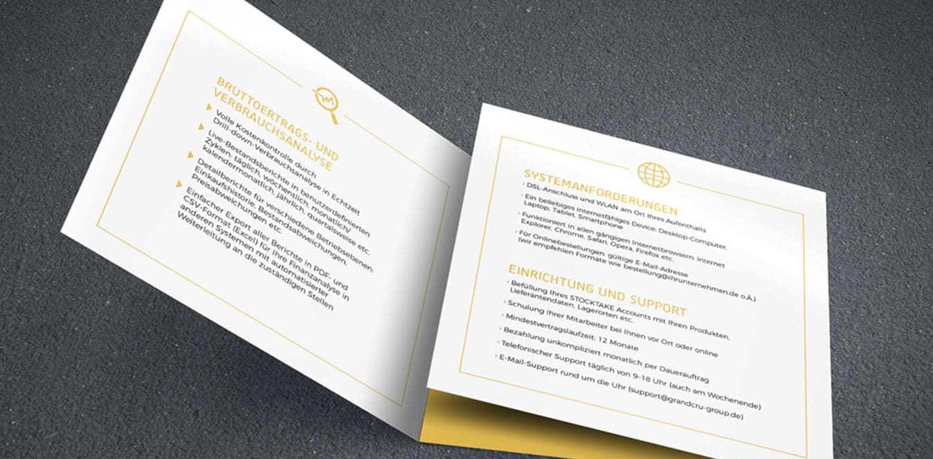 Das Programm bündelt dabei mit cloudbasiertem Konzept alles, was den Hotel- oder Gastronomiebetrieb wirtschaftlich macht: Bestände, Rezepte, Kosten und Bestellungen. Um dem Unternehmen ein einheitliches Bild zu geben, hat Weder & Noch ein neues Logo inklusive Visitenkarten und Briefpapier entwickelt. Zur Bekanntmachung des Warenwirtschaftssystems wurde außerdem, entsprechend des neuen Corporate Designs, ein passender Infoflyer gestaltet.