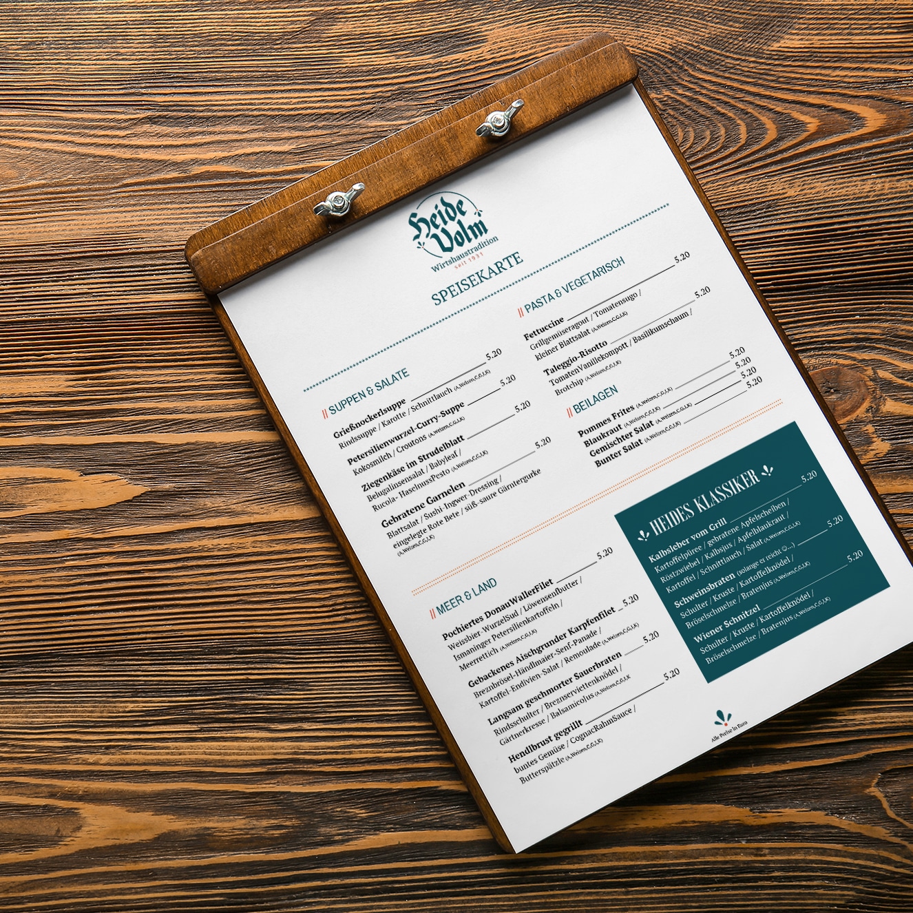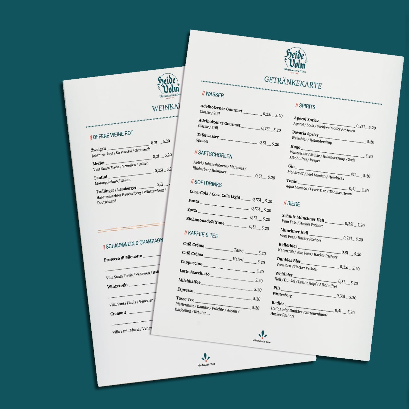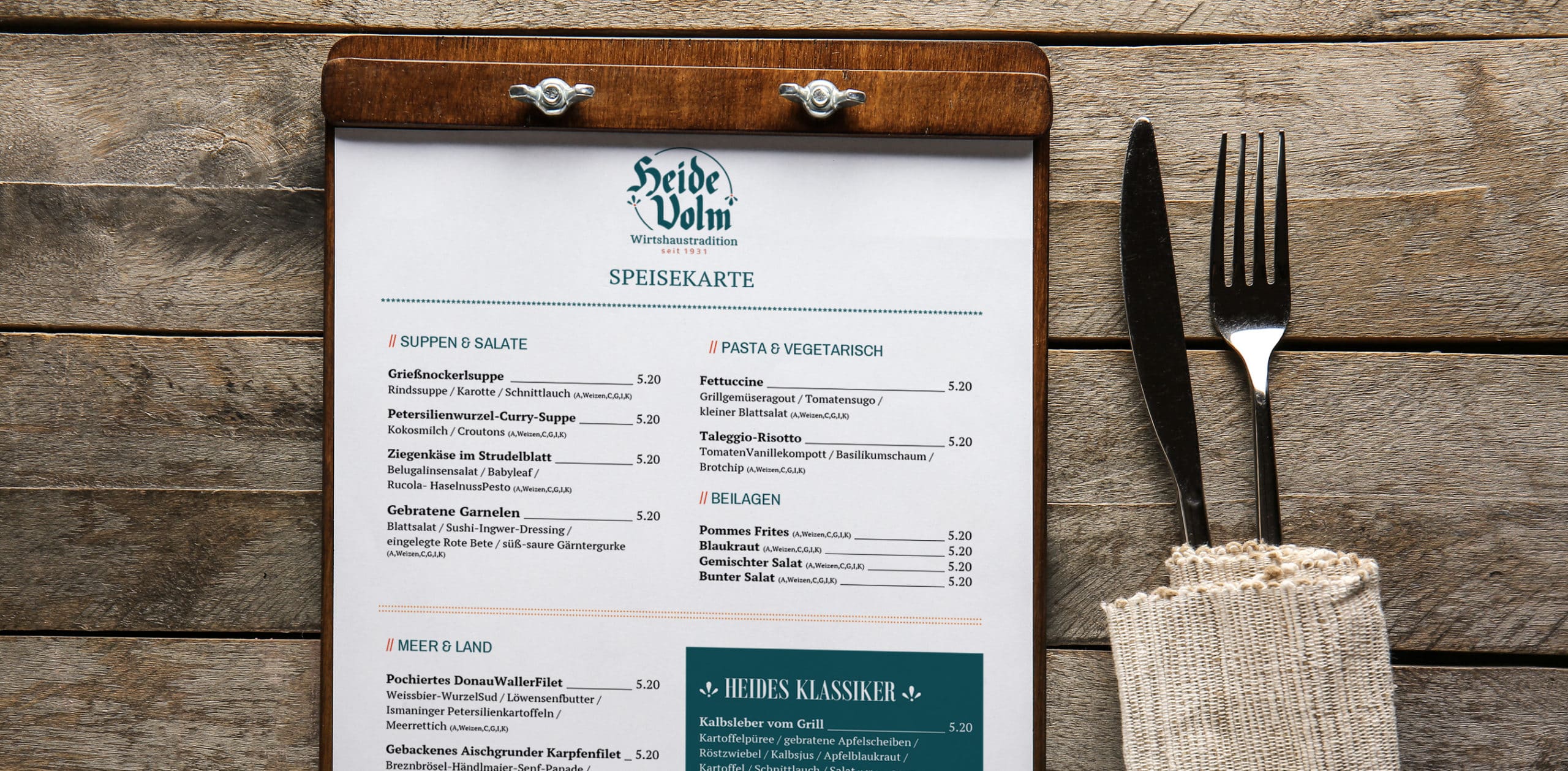 Eine Speisekarte mit wechselnden oder tagesaktuellen Angeboten schnell und einfach aktualisieren – die Lösung ist eine editierbare Word-Vorlage der Speisekarte für wechselnde Angebote. Für unseren Gastronomiekunden Heide-Volm haben wir dafür eine Vorlage erstellt und das Design an den neuen Auftritt der Website angepasst. Neu ist auch die Zusammenfassung der Kategorien innerhalb der Speisekarte. Je nach Bedarf kann die Speisekarte nun durch die Ein- und Ausblendung von Elementen in Umfang und Angebot variieren. Somit kann der Kunde das wechselnde Speisenangebot schnell und einfach anpassen.