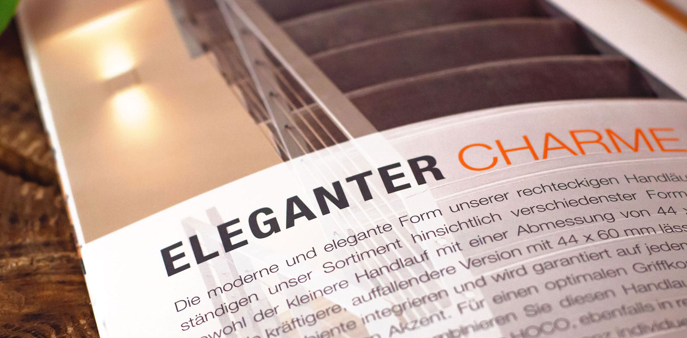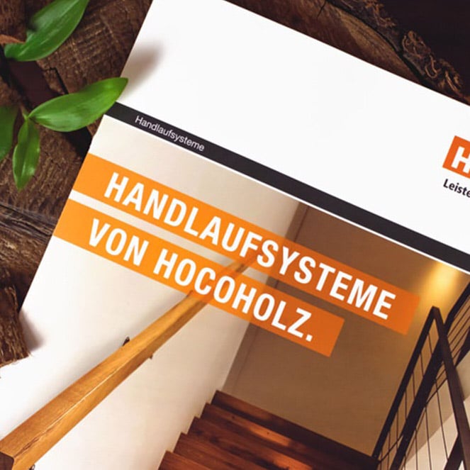 Damit die Handlaufsysteme von HocoHolz ins rechte Licht gerückt werden, wurden wir mit der Erstellung einer Broschüre beauftragt. Idee, Konzept und Gestaltung stammen komplett aus unserer Feder. Das klare Design mit modernen Stilelementen und verspielten Details bringt das Handlaufsortiment erst richtig zur Geltung.