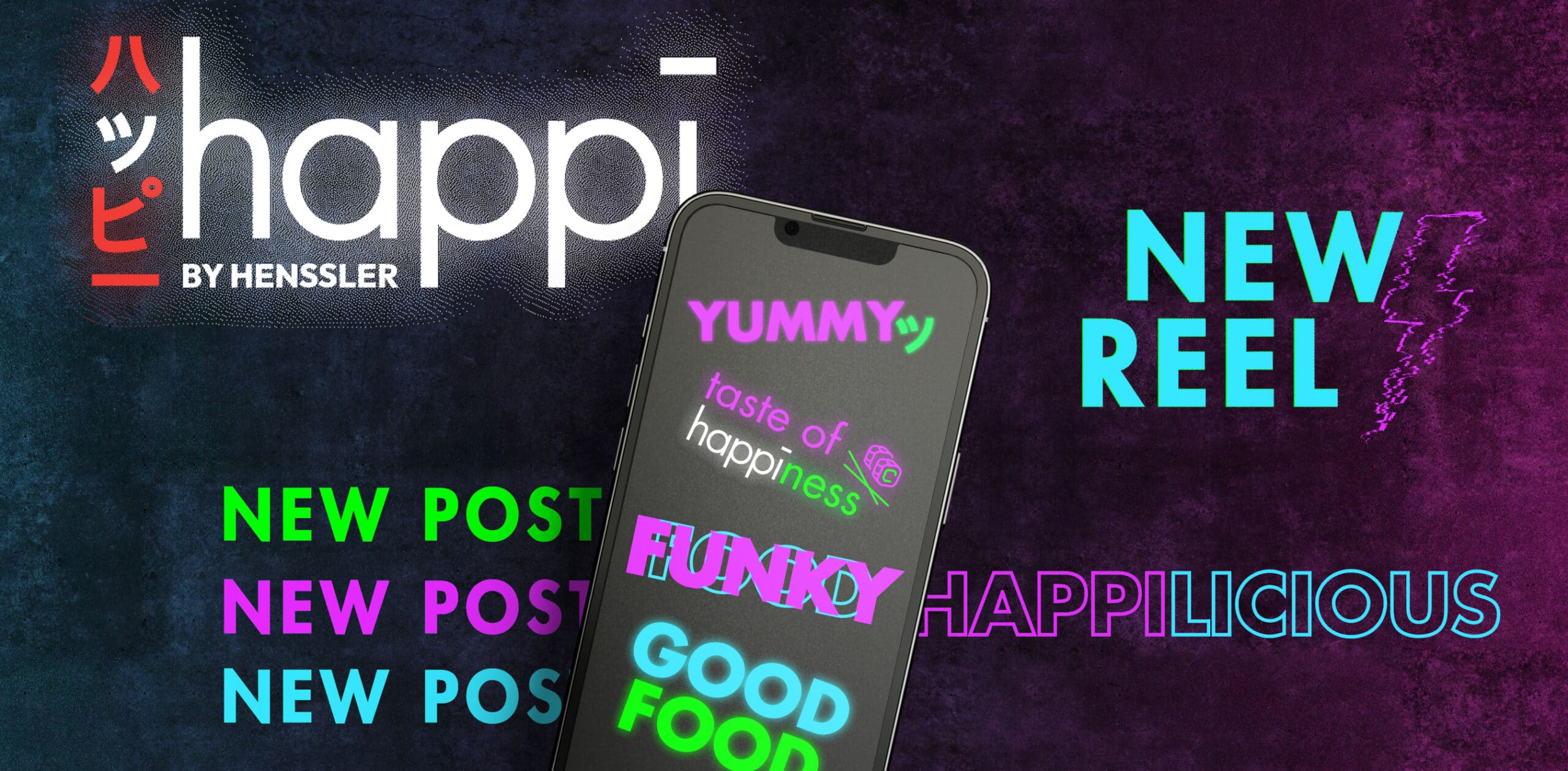Das happi by Henssler, die Sushi Bar 2.0, beschreibt sich selbst als funky, fast und casual – und das wird in der gesamten Bildsprache auch mehr als deutlich. Auffallende Neon-Farben und Glitch-Effekte prägen das visuelle Erscheinungsbild der Marke. Damit auch der Social Media Auftritt perfekt zum Corporate Design passt und ebenso auffällt, übernahm MATTER & LØUT die Konzeption, die Kreation sowie die Umsetzung selbst und kümmerte sich um die Bereitstellung von GIFs. Die GIFs stehen Usern und Fans ab sofort auf Instagram z. B. unter dem Keyword „happi by Henssler“ zur Verfügung.