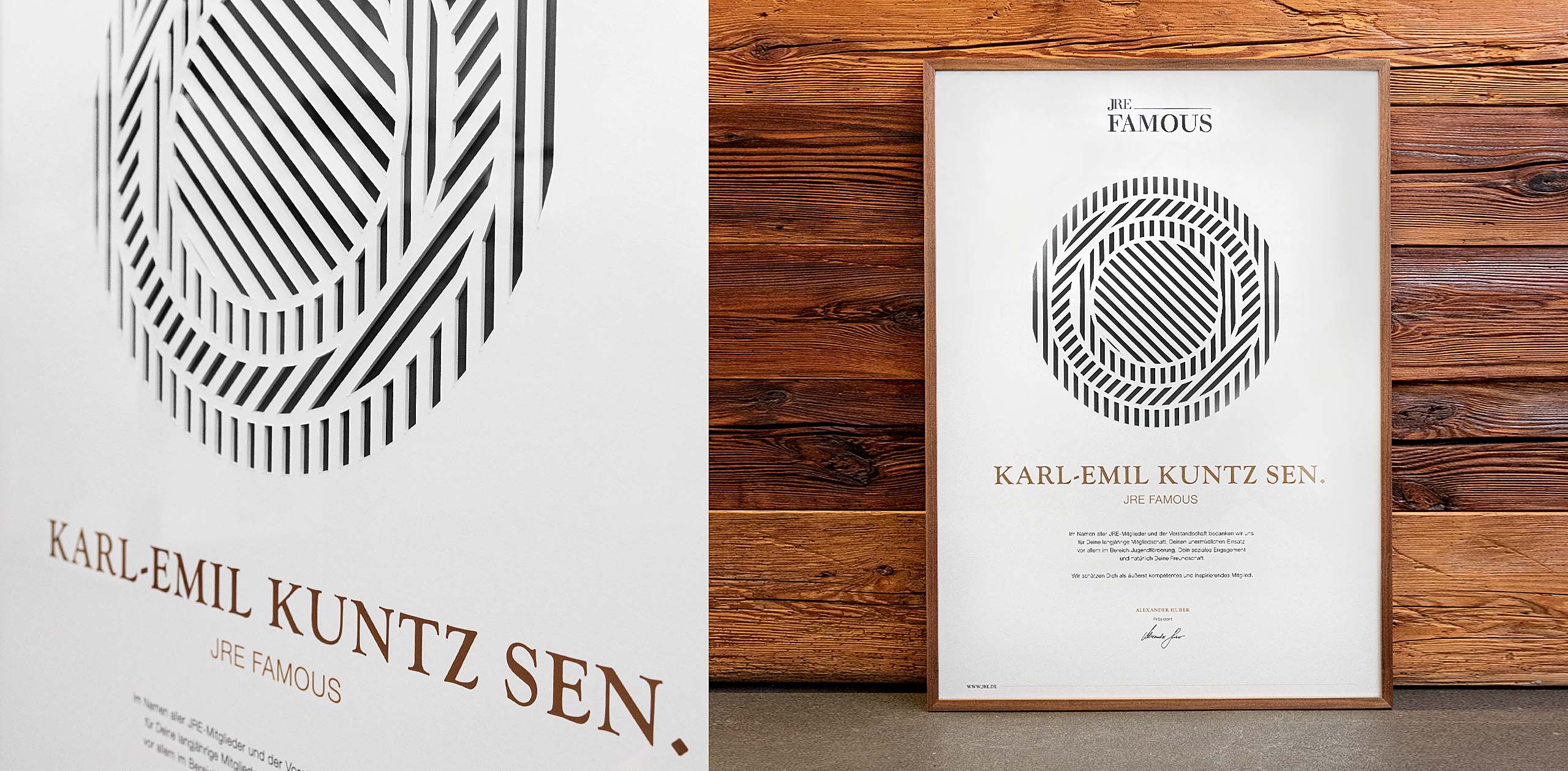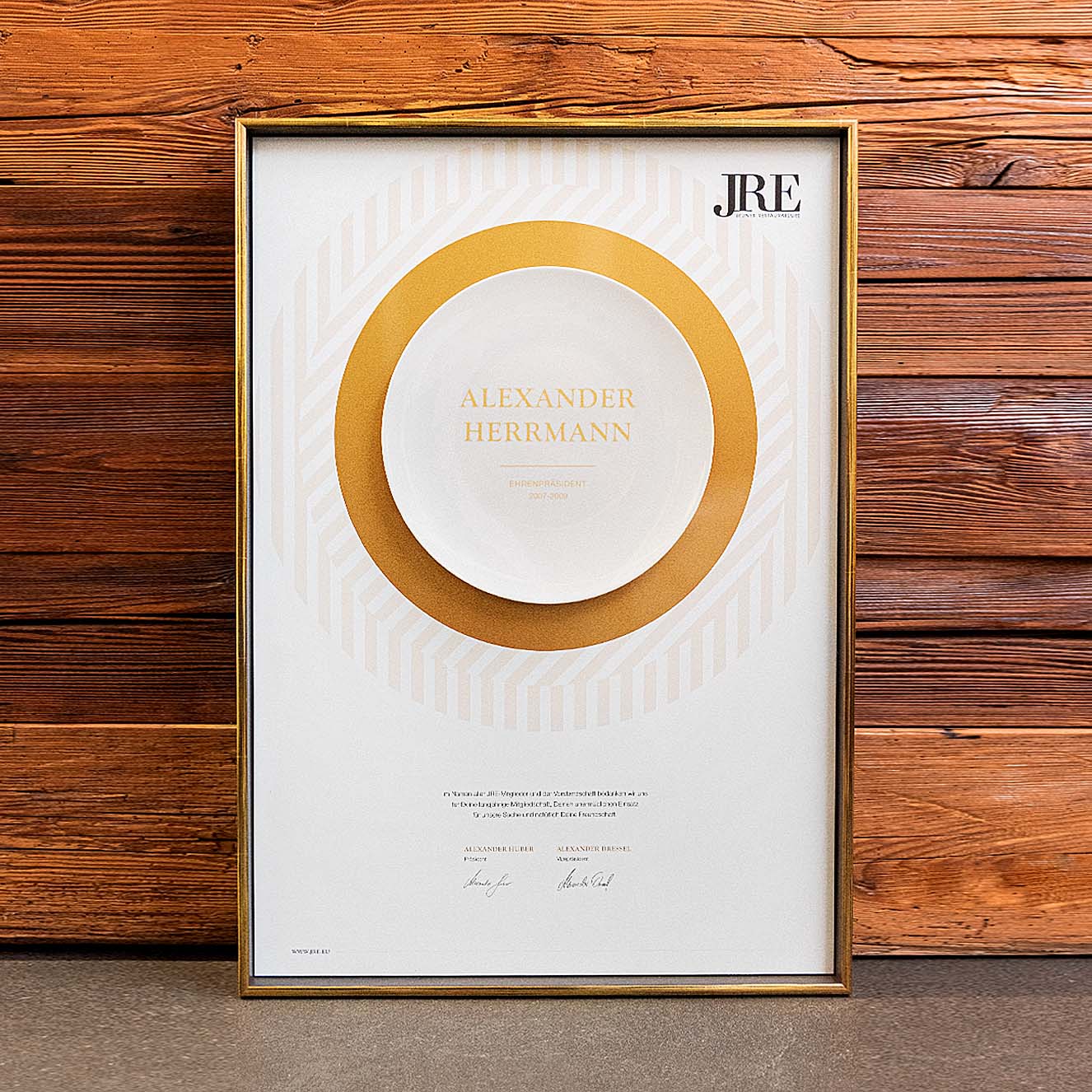Die Vereinigung JRE Deutschland ehrte mit den Ehrenpräsidenten- und Famous-Urkunden Mitglieder, die sich besonders in der Vereinigung verdient gemacht haben. Im Rahmen der laufenden Betreuung der JRE Deutschland durch Weder & Noch sind Urkunden zur Mitgliederehrung auf  der 30-Jahrfeier produziert worden. Um der aus Spitzenköchen bestehenden Vereinigung eine qualitativ hochwertige und passende Ehrung zu ermöglichen, hat Weder & Noch die zwei unterschiedlichen JRE Deutschland Ehrenpräsidenten- und Famous-Urkunden konzipiert. Bei den Ehrenpräsidenten sind die Namen und die Zeit der Präsidentschaft auf die Teller gedruckt. Nachfolgend wurden diese lasiert und erneut gebrannt. Diese sind auf bedruckten Alu-Dibond-Platten mit Stellschrauben befestigt. Im letzten Schritt wurden handgefertigte Goldrahmen mit Schattenfuge produziert und die Alu-Dibond-Platten von Hand eingeklebt. Mitglieder, welche in den Famous-Status übergehen, wurden mit einer Urkunde im Scherenschnitt-Design und mit handgefertigten Holzrahmen geehrt.