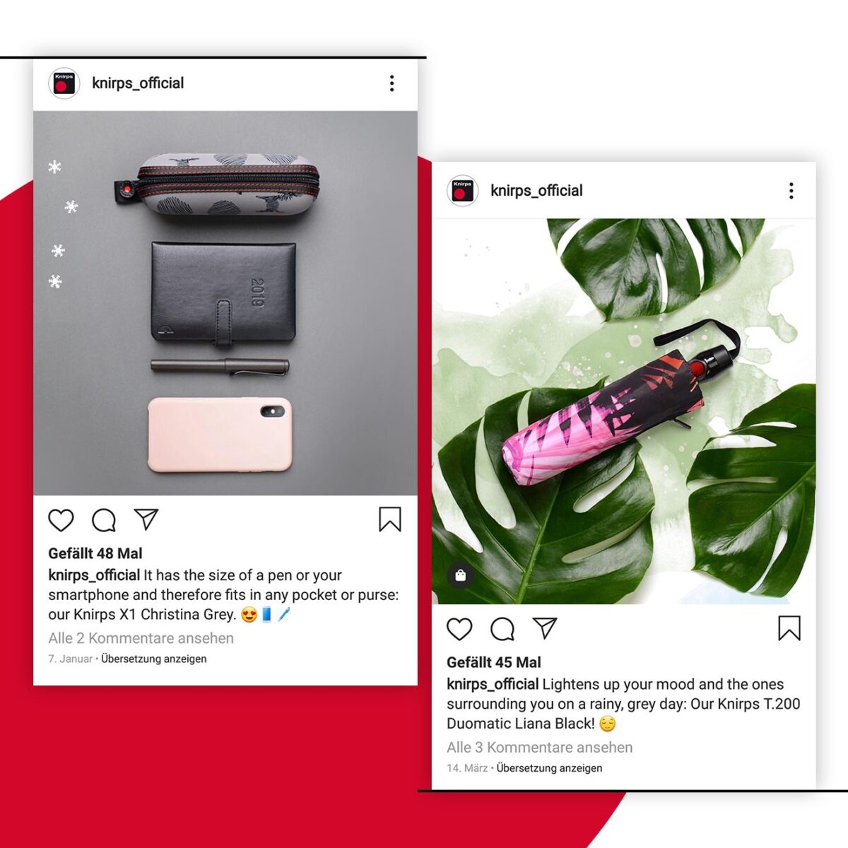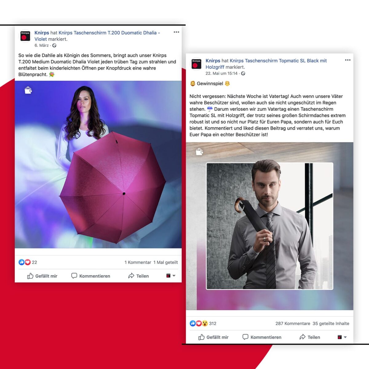 Für die Traditionsmarke Knirps, international bekannt für ihre ikonischen Taschenschirme seit 1928, begleiteten wir über mehrere Jahre hinweg den Social-Media-Auftritt auf Facebook und Instagram.