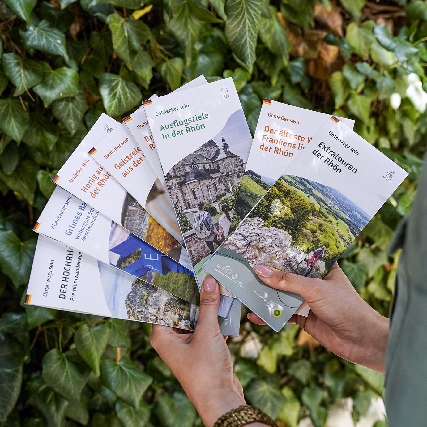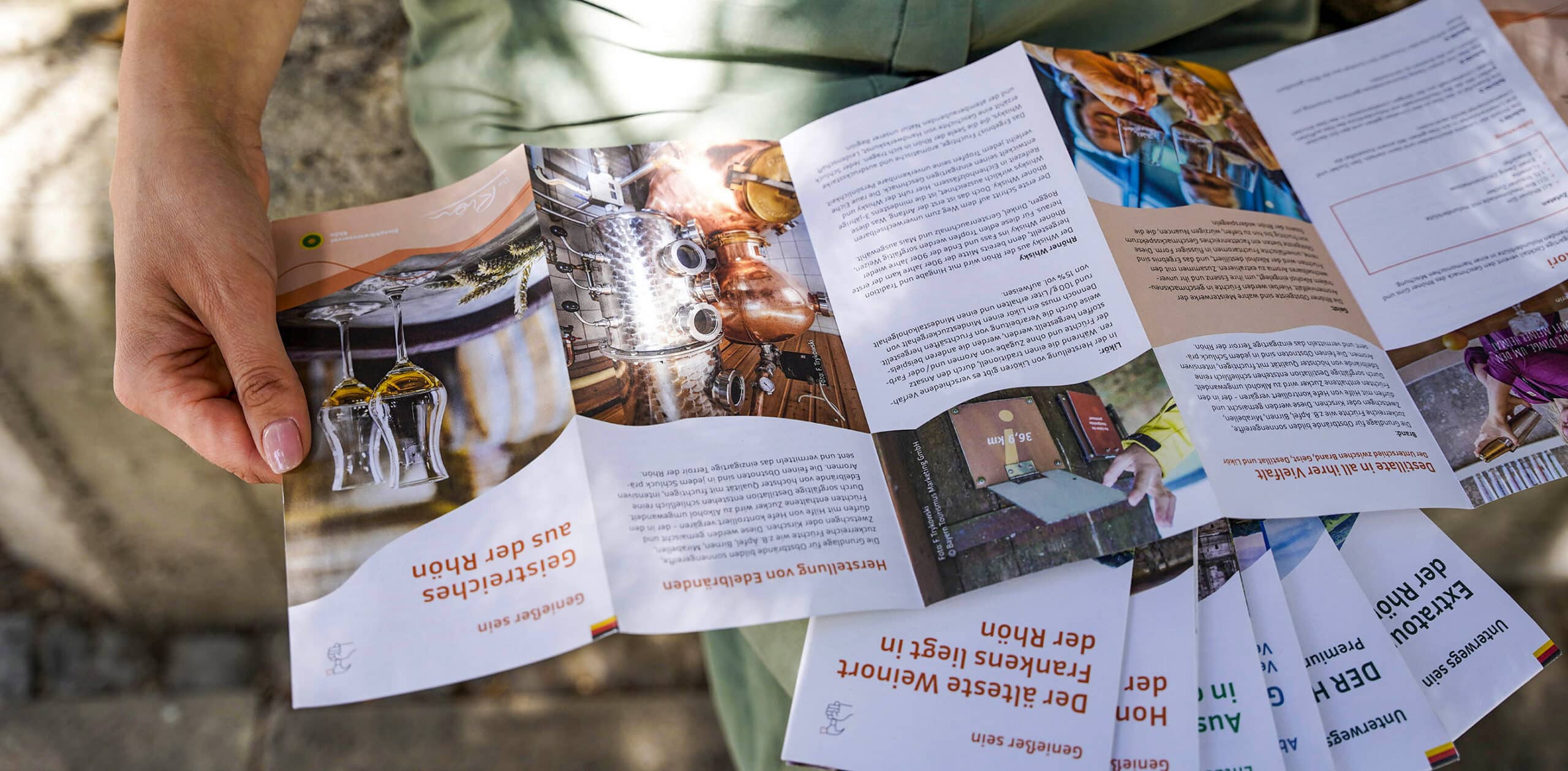 Konzeption und Gestaltung von Flyer für unseren Kunden Rhön GmbH. Im Rahmen des Projektes wurden insgesamt acht Flyer umgesetzt, um die Vielfalt und Attraktivität der Rhön-Region auf informative und ansprechende Weise zu präsentieren. Vier Genussfibeln, die Themen der Rhöner-Tradition widmen und vier größere Informationsflyer, die sich auf Wanderungen, Ausflugsziele und Besuchsorte konzentrieren. Die Flyer enthalten Kartengestaltung, um Routen und Standorte übersichtlich darzustellen, informative Texte, sowie sorgfältig ausgesuchte und teilweise bearbeitete Bilder, die die landschaftliche Schönheit und die Sehenswürdigkeiten der Rhön visualisieren.