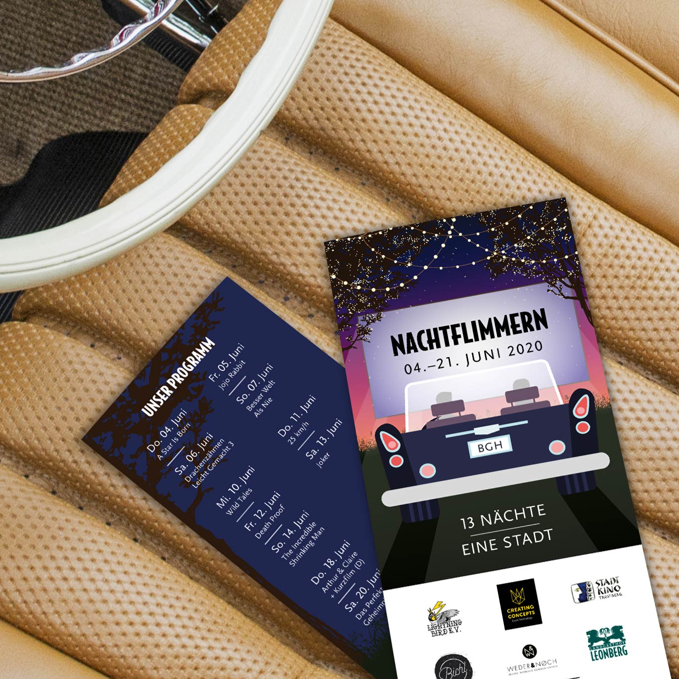 „Nachtflimmern“ – das erste Autokino in Burghausen hat sein Brand Design durch Weder & Noch bekommen. Im Mai 2020, inmitten der Corona-Pandemie und in Zeiten von Kontaktbeschränkungen und geschlossenen Kulturstätten entstand die Idee, ein Autokino in Burghausen auf die Beine zu stellen. Um auf die Situation von Gastronomen und Kulturschaffenden aufmerksam zu machen und diese mithilfe der Einnahmen aus dem Autokino zu unterstützen, haben auch wir unseren Teil beigetragen. Der Kulturverein Lightning Bird e. V. organisiert in Zusammenarbeit mit einem ortsansässigen Veranstaltungstechniker, einem regionalen Gastronomen und Kinobesitzer Nachtflimmern – das erste Autokino der Stadt Burghausen. Weder & Noch hat das ehrenamtliche Projekt im Bereich Naming, Branding, sowie Online Marketing unterstützt. Entstanden ist „Nachtflimmern“ und ein Branding, das nostalgisches Retro Flair vermittelt. Außerdem haben wir die Website realisiert und gezielte Social Media Marketing Kampagnen für die einzelnen Filmvorstellungen gefahren.
