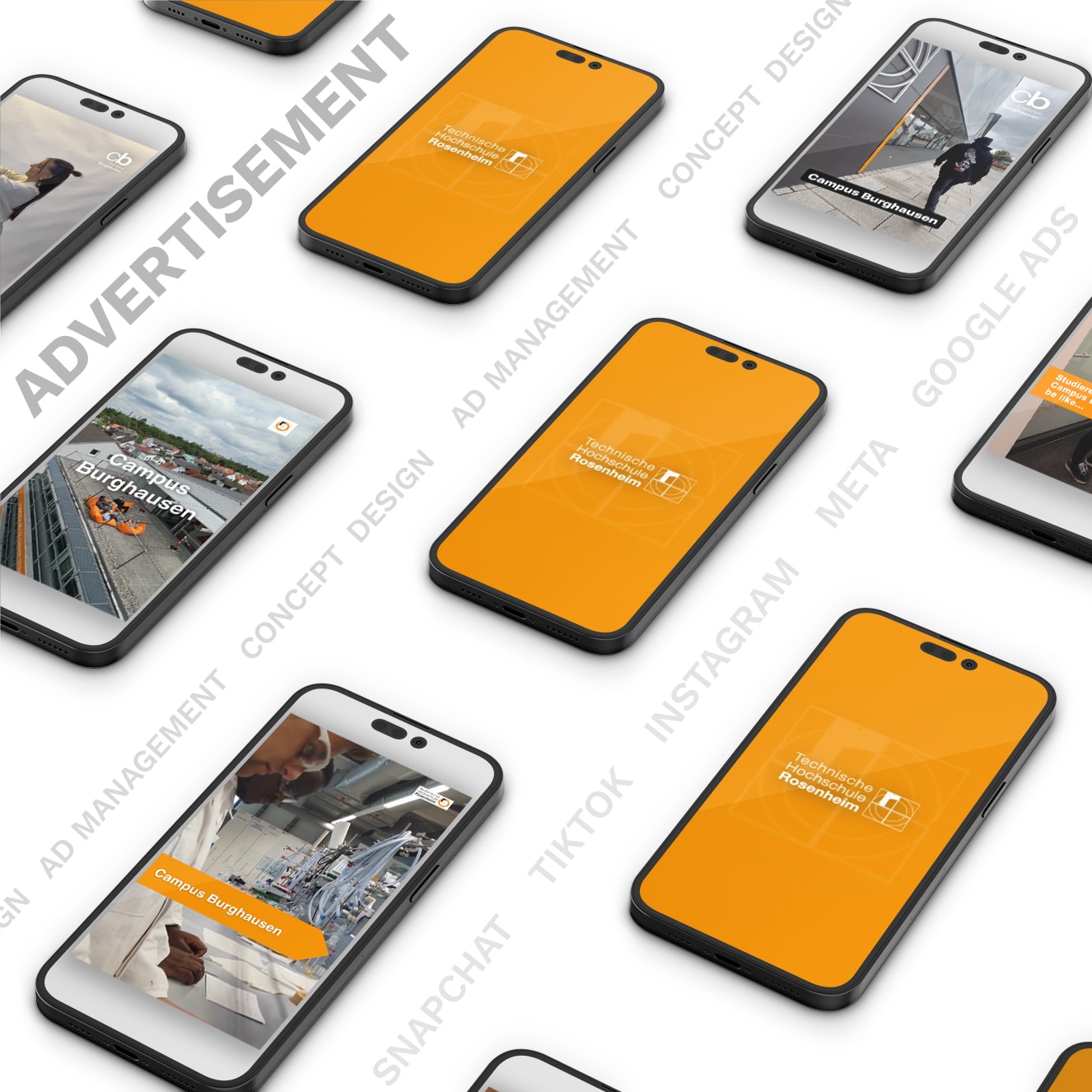 Der Campus Burghausen ist eine Einrichtung der Technischen Hochschule Rosenheim. Um neue Studierende zu gewinnen, setzte die Hochschule auf Social-Media-Werbung, welche wir als Agentur umsetzten. Nach einer Konzeption für die diesjährige Bewerbung entschieden wir uns die Werbekampagnen auf den verschiedenen Plattformen Meta, Snapchat, TikTok und Google auszuspielen. Bei der Entwicklung und Gestaltung dieser Werbeanzeigen wurden sowohl die spezifischen Interessen der Zielgruppe des Campus Burghausen als auch die neuesten Social-Media-Trends berücksichtigt.