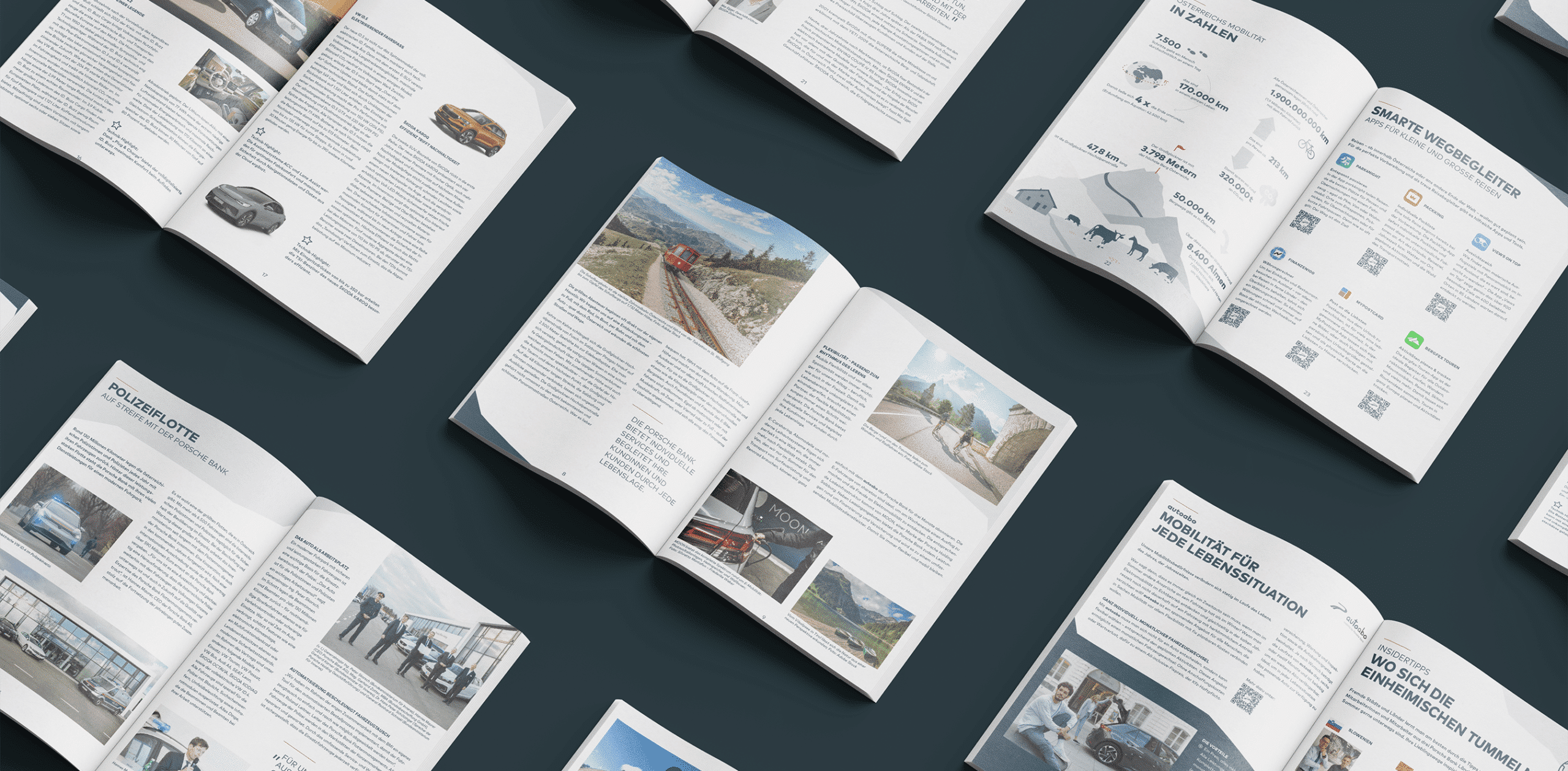 Jährlich gestaltet Matter & Lout in enger Zusammenarbeit mit der Porsche Bank das Kundenmagazin „In Bewegung“. Die Redaktionssitzungen zu Beginn des Jahres dienen der gemeinsamen Entwicklung von Inhalten zu saisonalen Themen und der Identifikation von Trends. Das Ziel ist es, ein passendes Layout für das Magazin zu konzipieren und zu gestalten. In diesem Sommer steht das Printprojekt ganz im Zeichen der Reiselust in Österreich, mit Tipps zu Wanderrouten, Fahrradtouren und Empfehlungen für Reise-Apps.