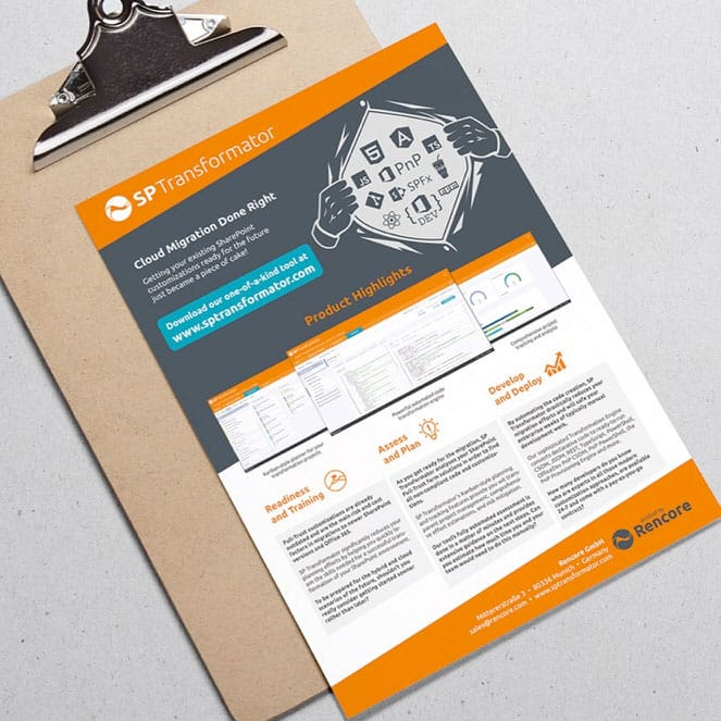 Rencore ist ein Softwareunternehmen, das seinen Kunden Software-Lösungen anbietet, die mehr Transparenz in den Microsoft SharePoint- und Office 365-Entwicklungsprozess bringen. Wir hatten die Aufgabe, das Corporate Design für die Firma und ihre Produkte zu erarbeiten. Außerdem durften wir für das Produkt „SP Transformator“ eine Website entwickeln und umsetzen, die das Produkt, seine Features und Vorteile vorstellt.