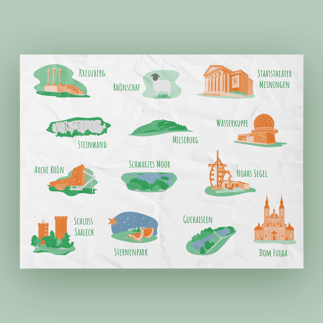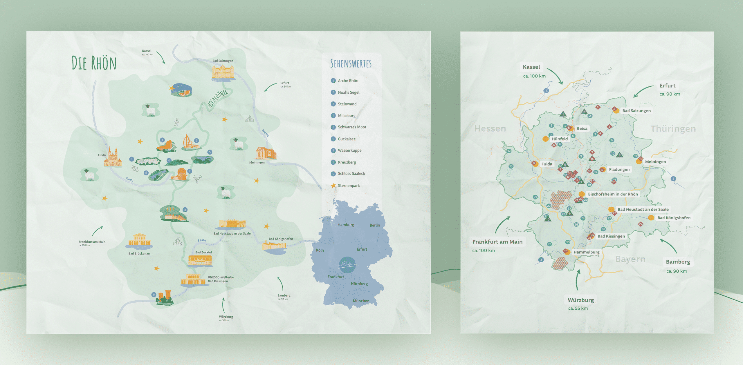 Für die Rhön GmbH galt es zwei Konzepte für Umgebungskarten umzusetzen. Matter & Lout setzte dies anhand eines maßstabgetreuen und illustrativen Kartendesign um. Die beiden Karten der Rhön dienen als Überblick über wichtige POIs, Touren und Verkehrswege sowie der Verortung innerhalb von Deutschland. Dabei achteten wir darauf, dass in der maßstabsgetreuen Karte die Legende und die Ebenen der Karten detailliert beschriftet sind. Die illustrative Karte mit den teils comichaften Elementen dient dem Gast als Inspiration für Ausflugsziele innerhalb der Rhön Region. Beide Karten haben wir mit Adobe Illustrator aufbereitet. Die Inhalte wurden in verschiedenen Ebenen für die unterschiedlichen Themengebiete angelegt. Hierdurch haben wir die selbstständige Bearbeitung und Darstellung im Nachgang für die Rhön GmbH vereinfacht.