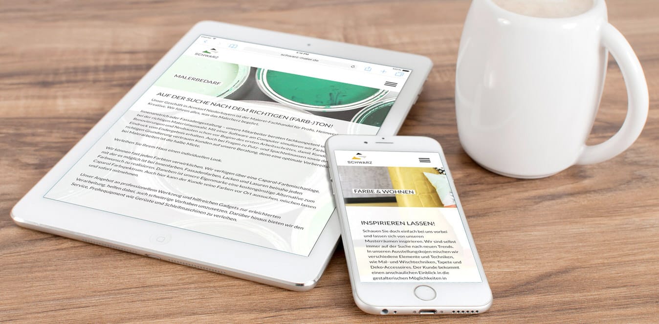 Für den Malerbetrieb und Malerbedarf Schwarz GmbH aus Arnstorf durften wir den Relaunch der in die Jahre gekommenen Website umsetzen. Ziel war es nicht nur der Seite ein ansprechendes und modernes Design zu geben, das natürlich auch auf mobilen Geräten funktioniert, sondern konzeptionell und optisch die Vielfältigkeit der einzelnen Bereiche (Malerbetrieb, Malerbedarf, Farbe & Wohnen, Pulverbeschichtung und Werbetechnik) darzustellen. Die Seite funktioniert am Smartphone wie am Rechner und sieht gut aus.