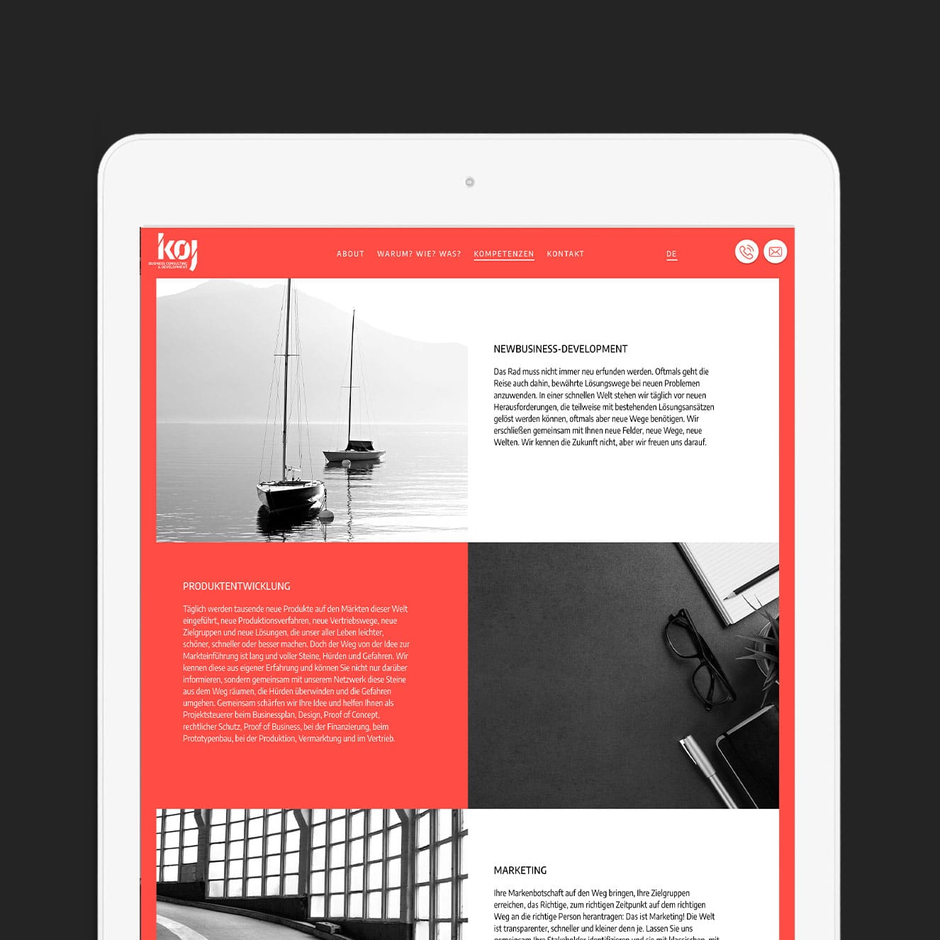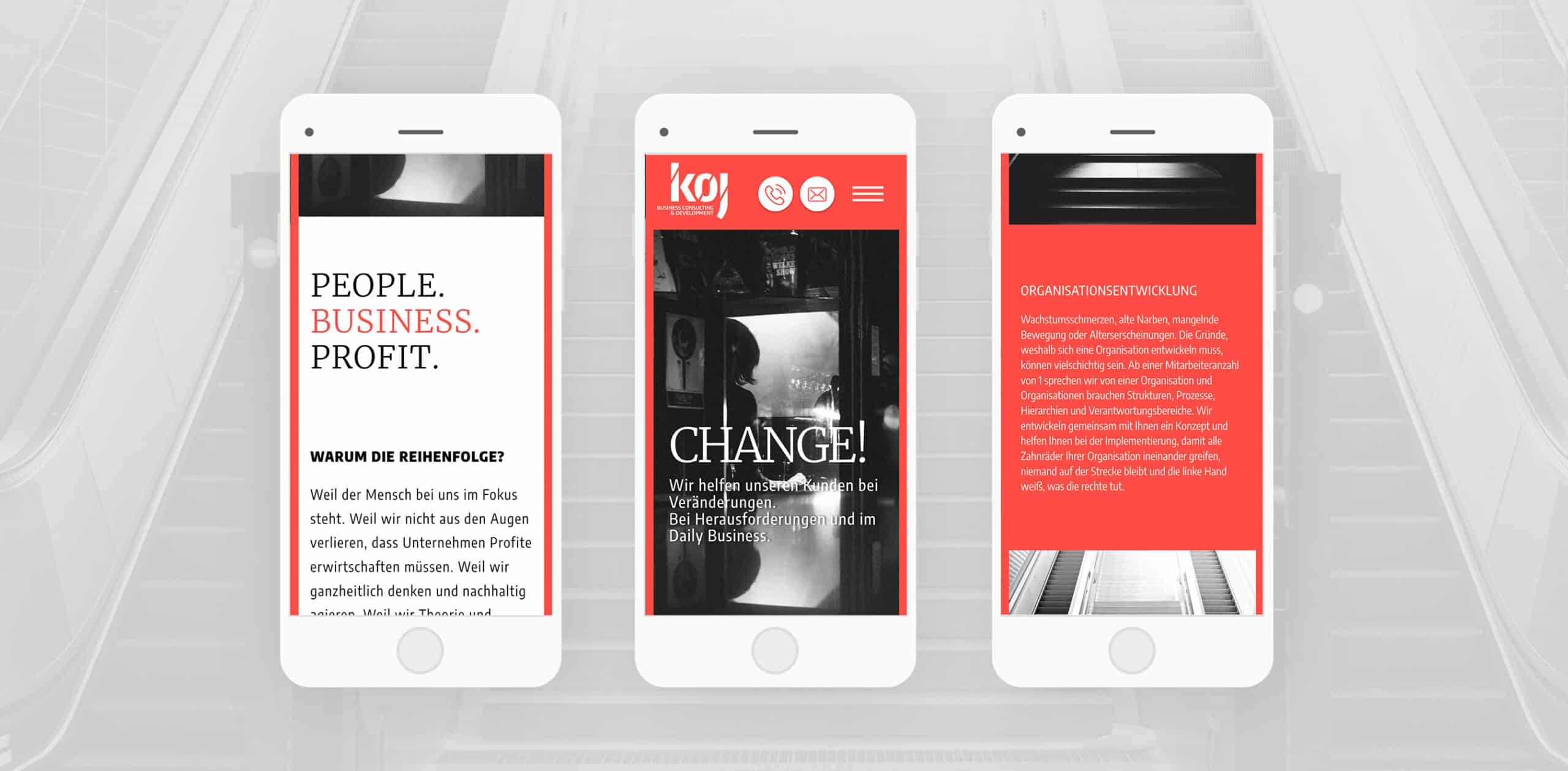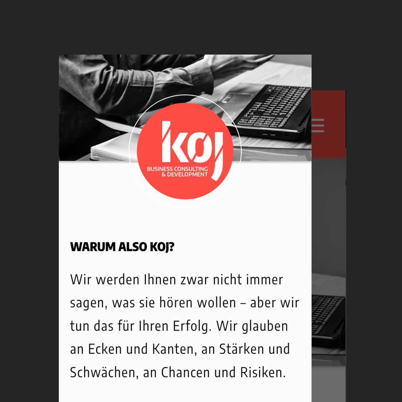 Für die koj GmbH stampfte Weder & Noch eine völlig neue Markenwelt aus dem Boden: Wir begleiten das Unternehmen seit seiner Gründung und entwickelten sowohl Konzept, Corporate Design als auch sämtliche Werbemittel für unseren Kunden. Im Webdesign setzten wir das Angebot mithilfe des CDs entsprechend in Szene – nicht um den Fokus auf Farben und Formen zu lenken, sondern um das Angebot des Unternehmens gebührend zu präsentieren.