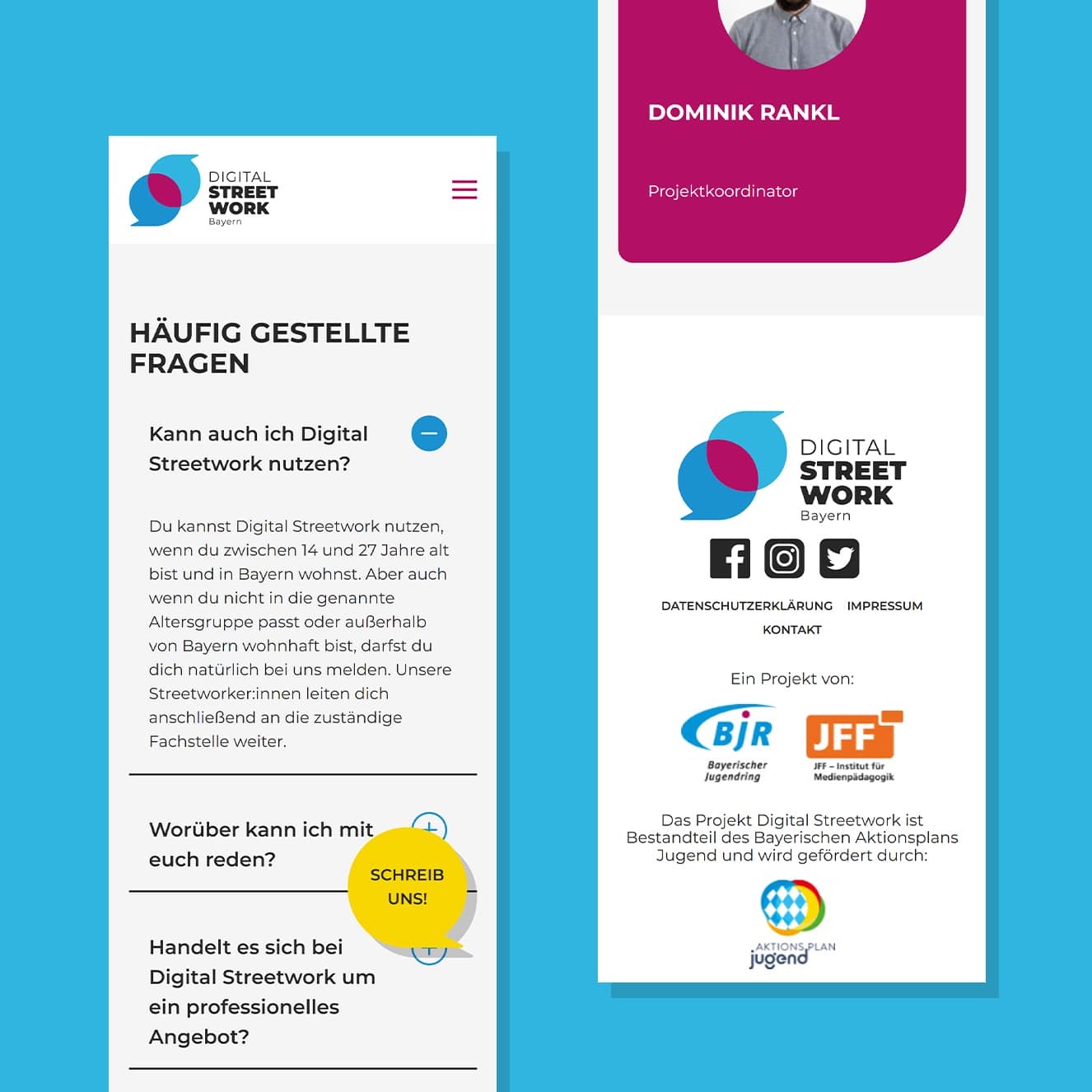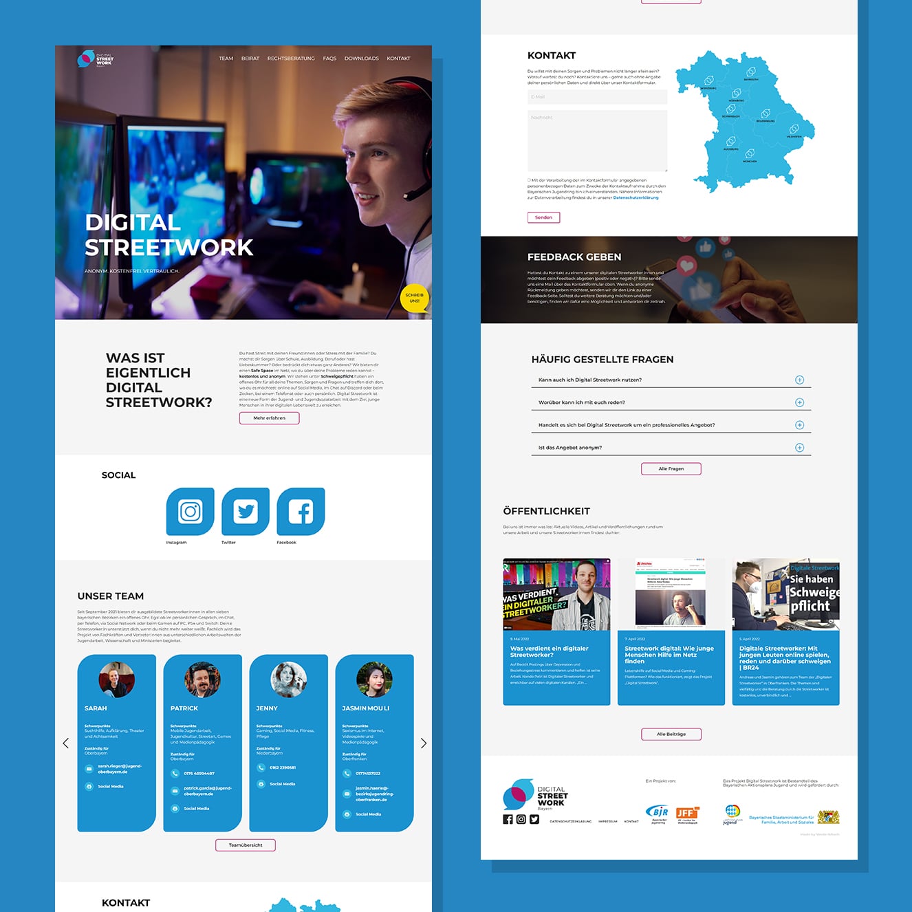Für die Digitalisierungskampagne des Bayerischen Jugendrings (BJR) „Digital Streetwork Bayern“ durfte Weder & Noch einen Website Launch durchführen. Die Website fußt auf dem Content Management System WordPress. Die Seite wurde im für die Zielgruppe passenden modernen Look erstellt und von unserer hauseigenen Entwicklungsschmiede umgesetzt. In Sachen Usability ist der Website Launch ein voller Erfolg, denn kurze Klickpfade führen schnellstmöglich zur gesuchten Information. Ein Blog soll nicht nur die Sichtbarkeit der Website, sondern auch des Projekts in der Öffentlichkeit gewährleisten. Ein Extra bildet außerdem eine Landkarte, die beim Klick auf den jeweiligen Standort automatisch die zuständige Person aus dem Backend lädt und diese anschließend in Form eines Overlays ausspielt. Das Besondere daran ist die Nutzung einer SVG-Datei, anstelle eines Bildes – als HTML verwendet wird diese schließlich klickbar.
