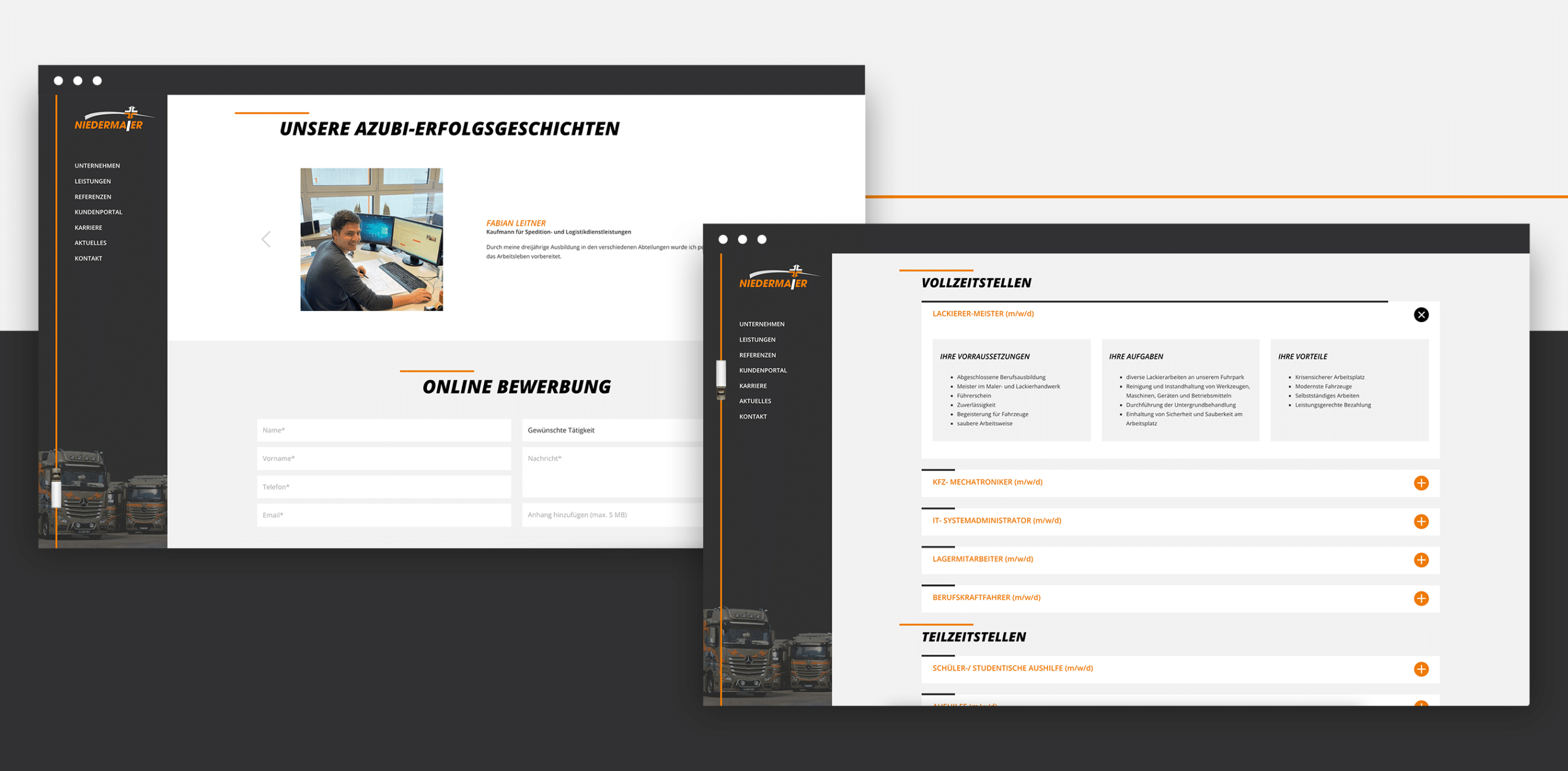 Die Niedermaier Spedition, mit Sitz im südbayerischen Raum, ist seit 75 Jahren ein aufstrebender Logistikdienstleister für namhafte Kunden. Damit dies zukünftig auch so bleibt, wurde Weder & Noch mit einem Website Relaunch beauftragt. Die neue Seite beinhaltet eine Schnittstelle für die Sendungsverfolgung der georderten Lieferungen. Die Anforderung an die neue Website, nach dem Website Relaunch nicht nur technisch auf dem neuesten Stand zu sein, sondern zudem in einem modernen und ausdrucksstarken Look zu erstrahlen, ist gelungen. Gerade die junge Generation soll hier angesprochen werden – nicht zuletzt im Hinblick auf das Employer Branding. So findet sich in der Menüführung ein LKW wieder, der sich beim Scrollen bewegt. Auch die Inhalte sind textlich am Zahn der Zeit und die Bildsprache ist durch starke Kontraste und entsprechende Perspektiven modern. Die Schnittstelle zur Sendungsverfolgung schafft kundenseitig einen weiteren Mehrwert: Kunden können den aktuellen Status ihrer Sendung online einsehen.