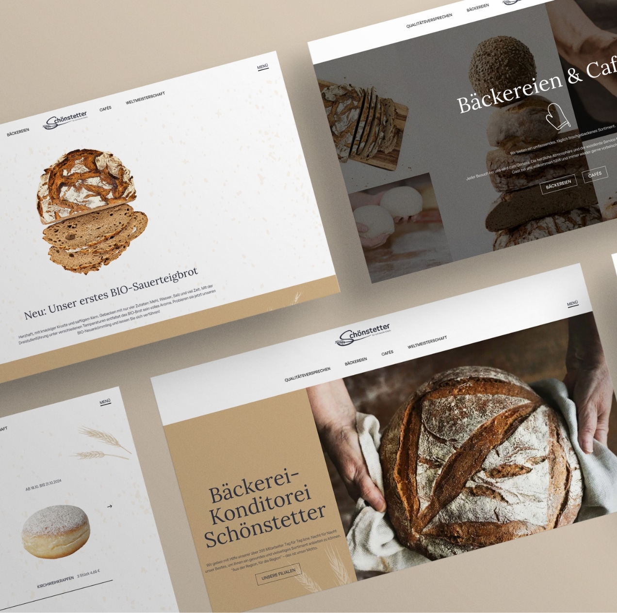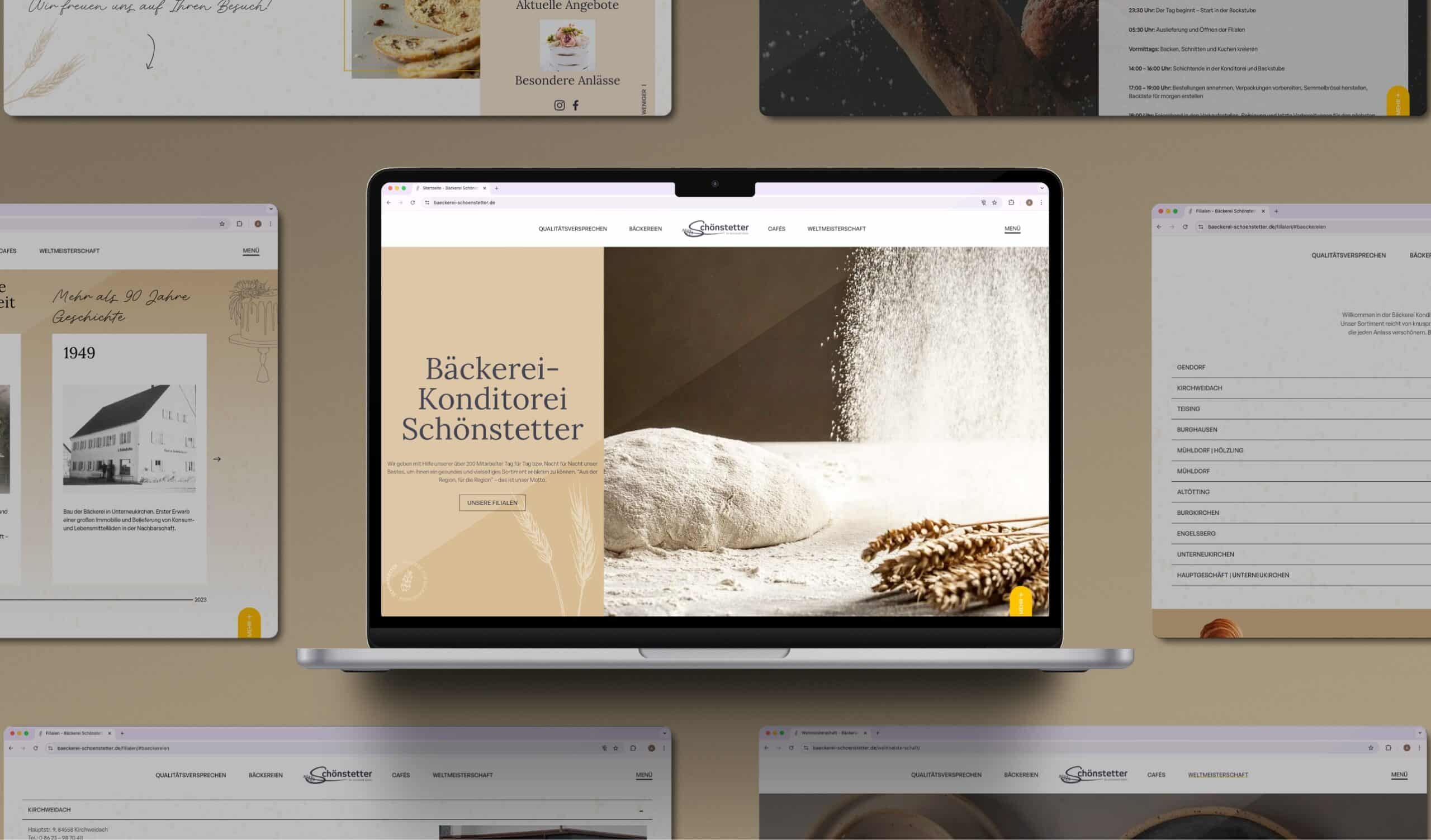 Die in Südostbayern etablierte Bäckerei Schönstetter hat seit Herbst 2024 eine neue Webseite. Das seit 1930 etablierte Familienunternehmen wird seit 2023 von der neuen Generation mit den beiden Töchtern Marille und Angelika geführt. Seither wurden die Filialen und Cafés umgebaut – modern, zeitgemäß und dennoch gemütlich. Die neue Webseite sollte das widerspiegel, aber dennoch die Herkunft und die vorherigen Generationen mit einbeziehen. WEDER & NOCH hat hier die Anforderung des Kunden konzeptionell und auch grafisch erarbeitet. In der technischen Umsetzung in WordPress wurde die Seite mit Features wie Webshop, Filialfinder und Buchungsoptionen programmiert und zukunftsfähig aufgestellt. Dank einer CMS-Schulung können die Mitarbeiter nun auch eigenständig die Inhalte jederzeit bearbeiten, was ebenfalls eine Kundenanforderung war, der wir sehr gerne nachgekommen sind.
